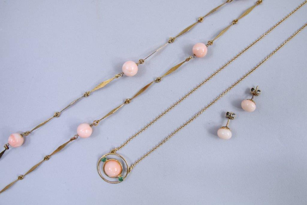 LOT composé d'un COLLIER, d'un PENDENTIF et sa CHAÎNE et deux CLOUS d'OREILLES en or jaune 750 millièmes ornés de cabochons et perles de corail.