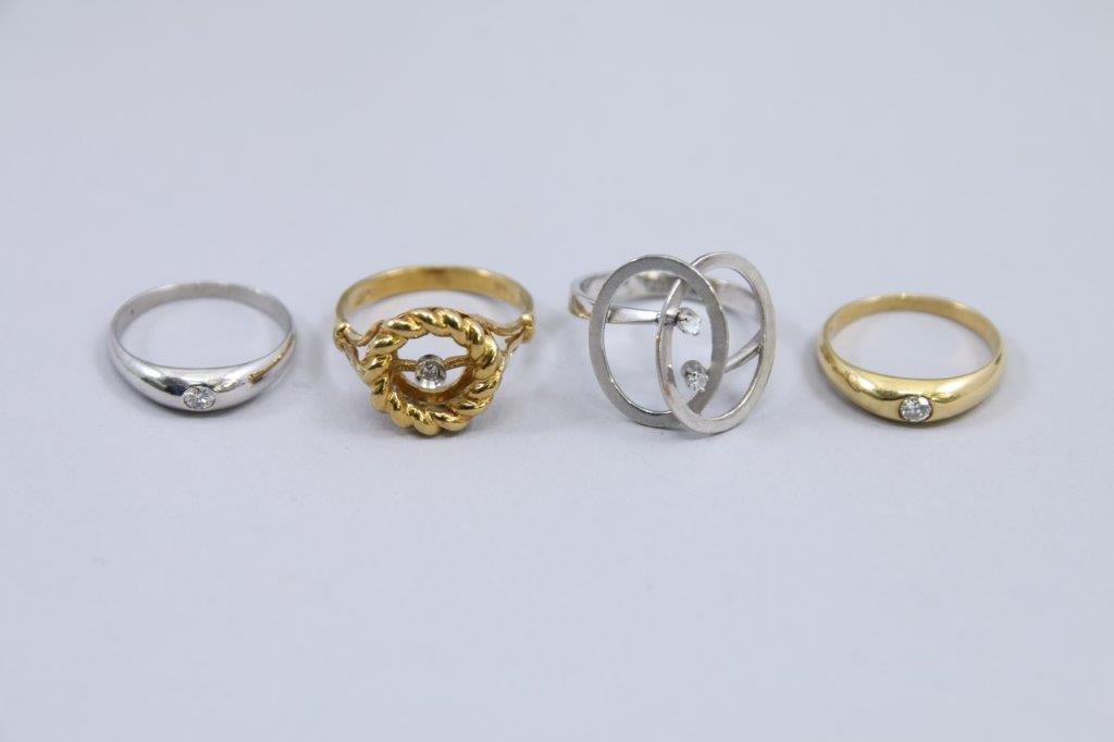 LOT de quatre BAGUES en or jaune et or gris 750 millièmes, chacune ornée d'un ou deux petits DIAMANTS.