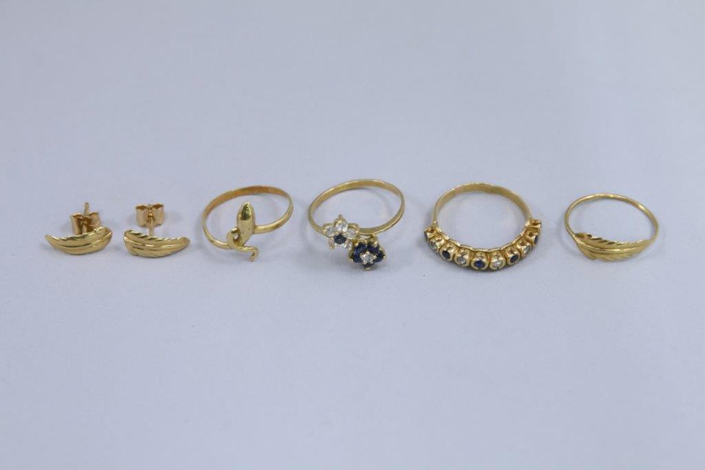LOT de quatre BAGUES et une paire de CLOUS d'OREILLES en or jaune 750 millièmes à décor de serpent, feuillages et marguerites. Deux bagues ornées de pierres blanches et bleues.