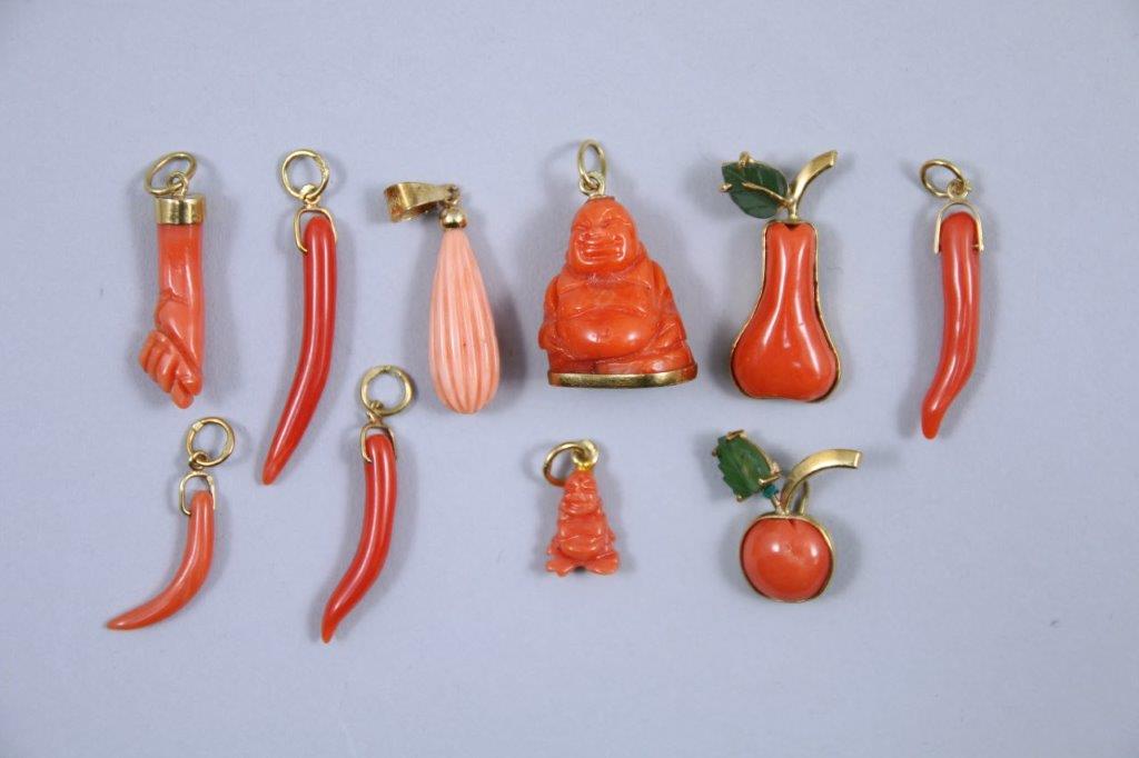 ENSEMBLE de PENDENTIFS en or jaune 750 millièmes ornés de corail prenant forme de gouttes, poire, pomme ou Buddha.