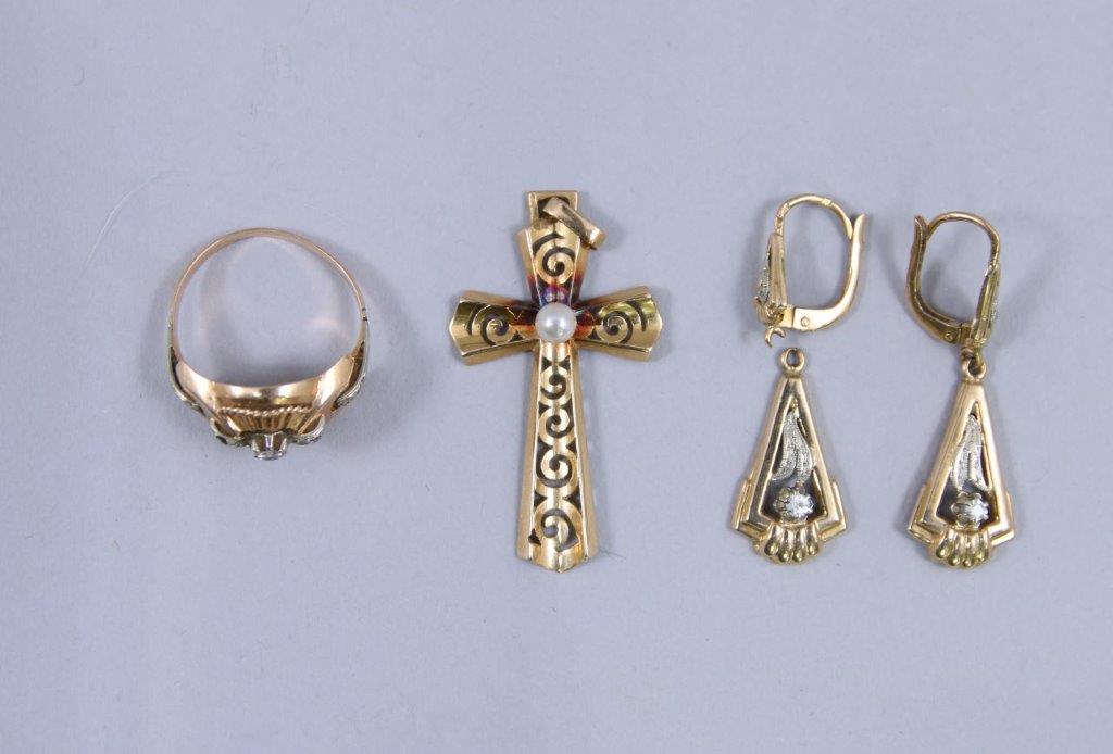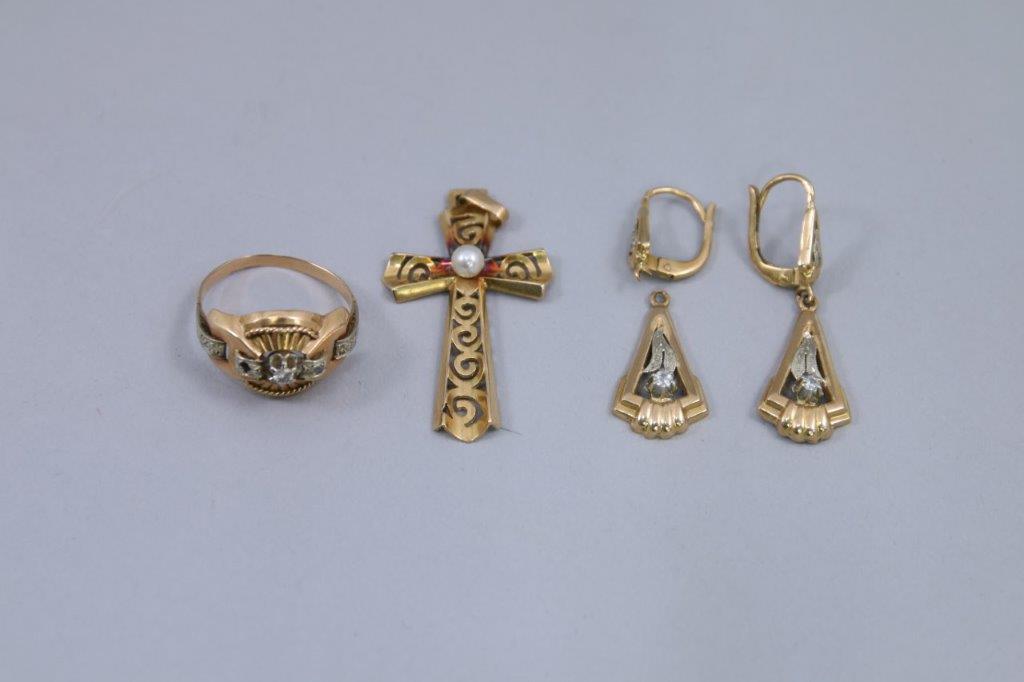 PARURE de DAME en or jaune 750 millièmes comprenant une PAIRE de BOUCLES d'OREILLES articulées ornée d'une petite pierre (2 g), une CROIX en PENDENTIF ornée d'une perle (3,2 g) et une BAGUE ornée de petites pierres (TDD 53, Poids 2,8 g.).