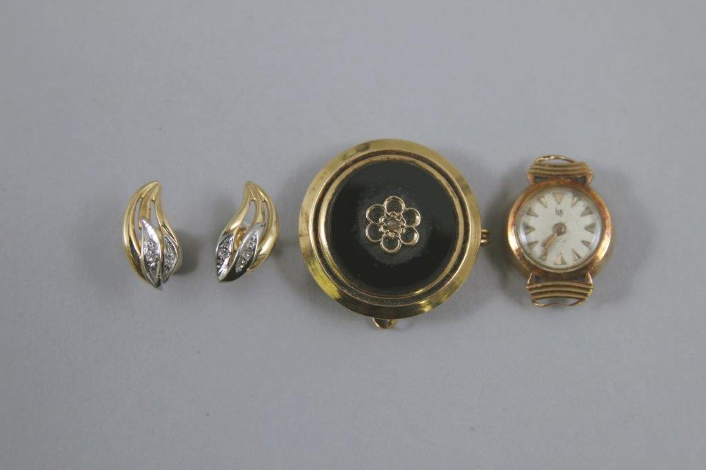 LOT comprenant: une BROCHE en onyx et or, deux CLOUS D'OREILLES et un BOÎTIER DE MONTRE en or jaune 750 millièmes.