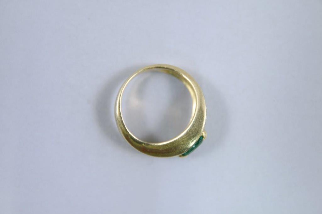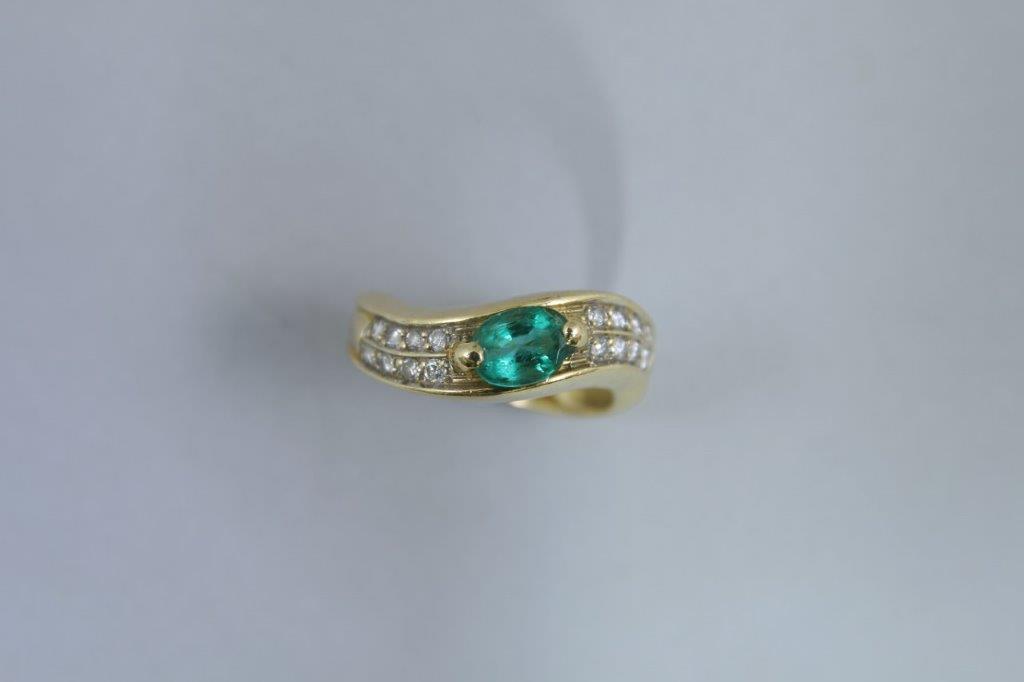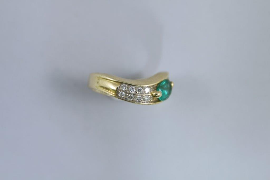 BAGUE en or jaune 750 millièmes, à la forme virevoltante ornée d'une ÉMERAUDE et de seize petits DIAMANTS.