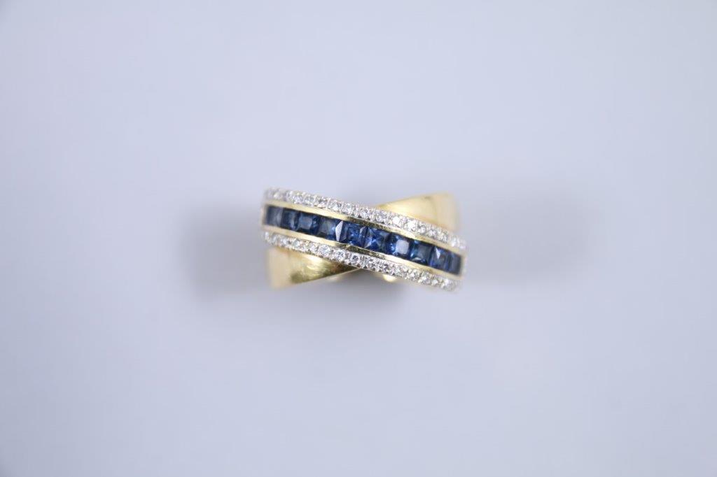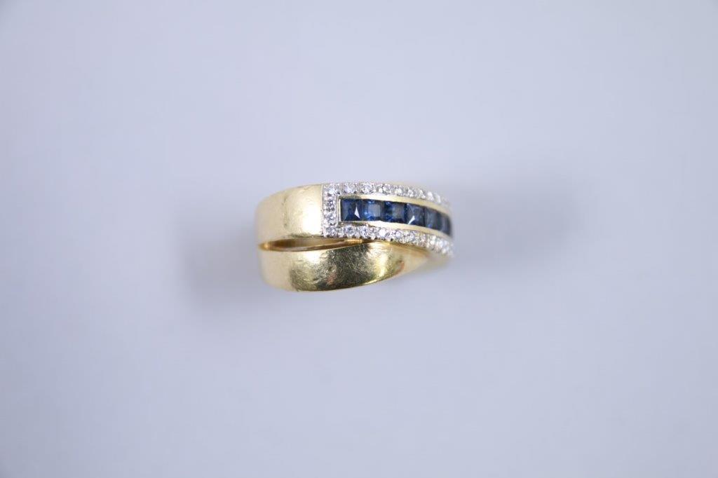 BAGUE en or jaune 750 millièmes formée d'un double anneau, l'un orné de brillants et de petits SAPHIRS carrés.
