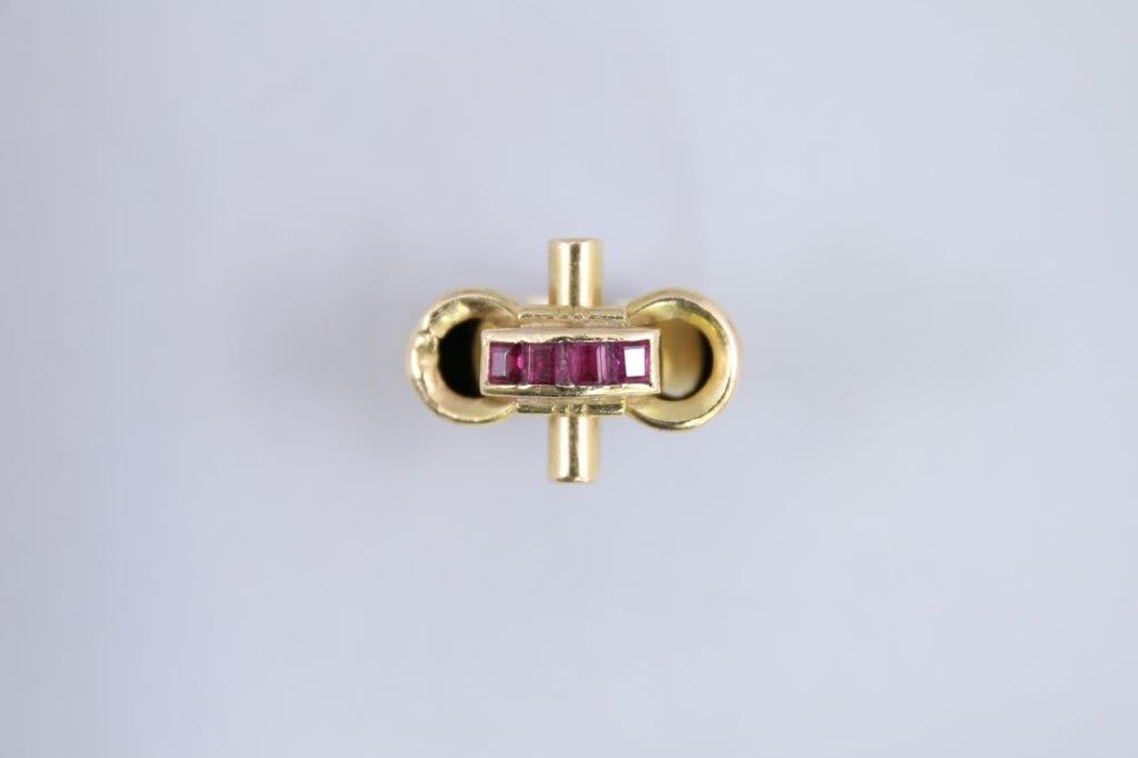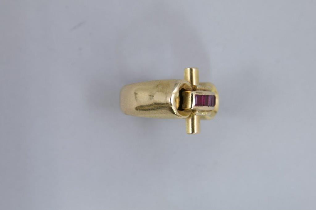 BAGUE TANK en or jaune 750 millièmes, ornée de quatre pierres rouges carrées dans un bandeau central.