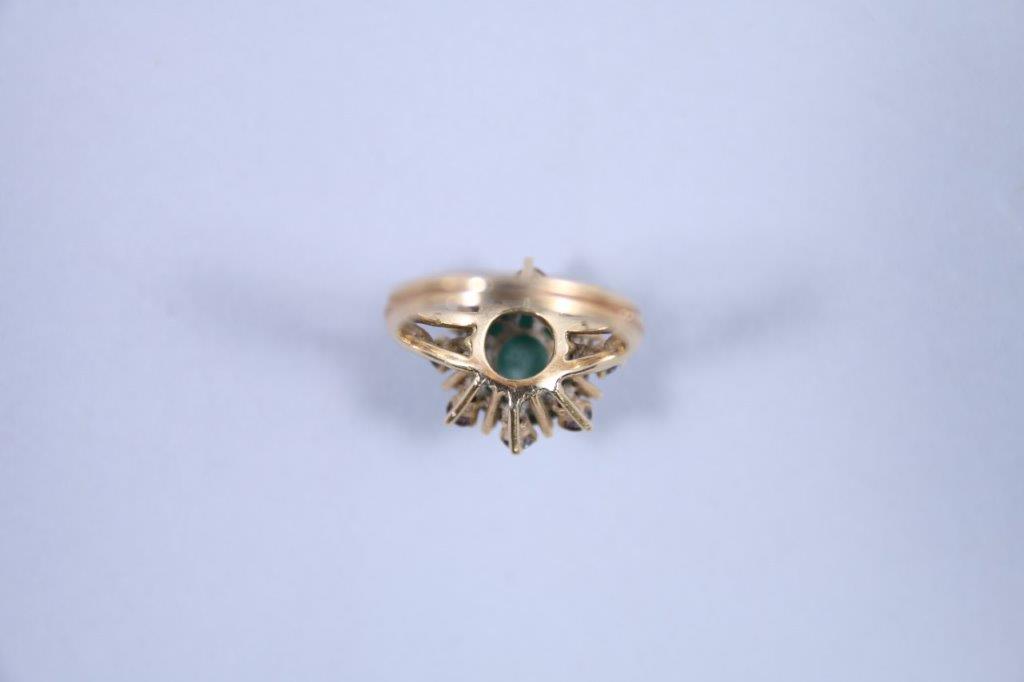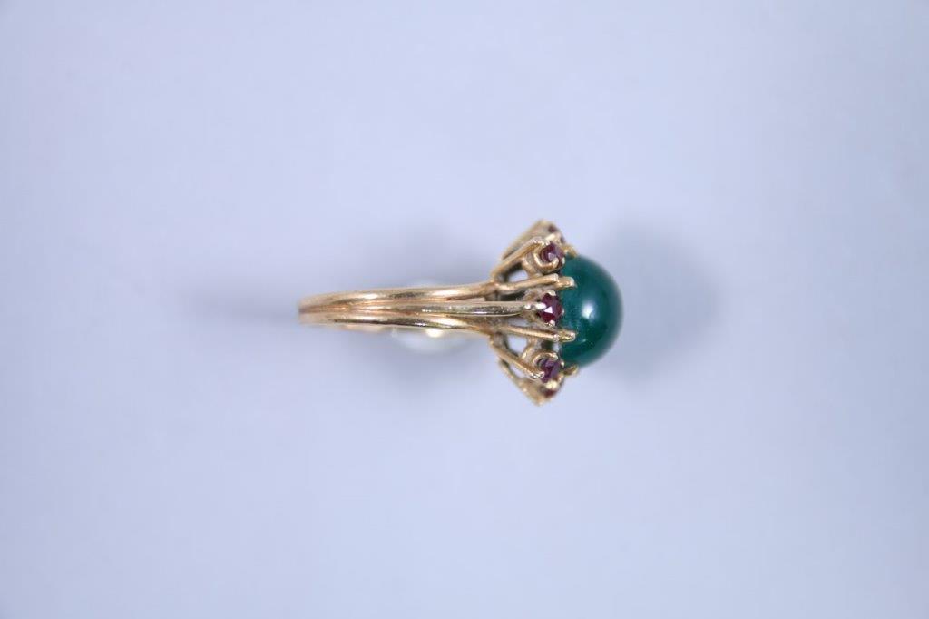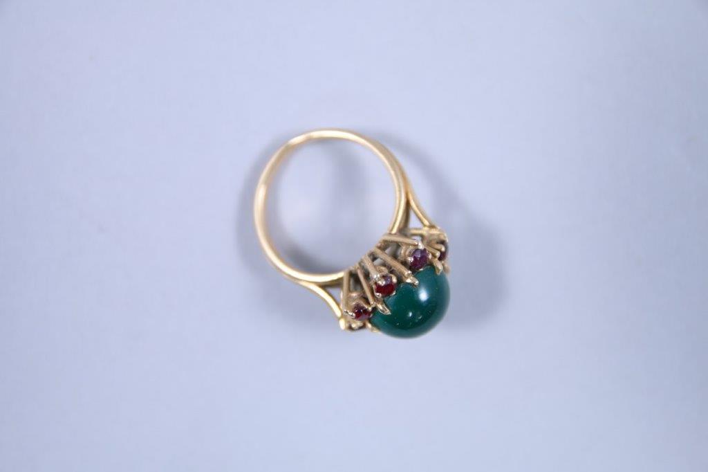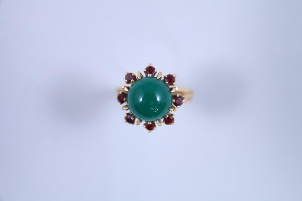 BAGUE en or jaune 750 millièmes ornée d'un cabochon de pierre verte dans un entourage de pierre rouge (GRENAT?).