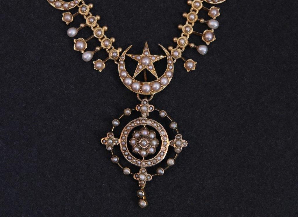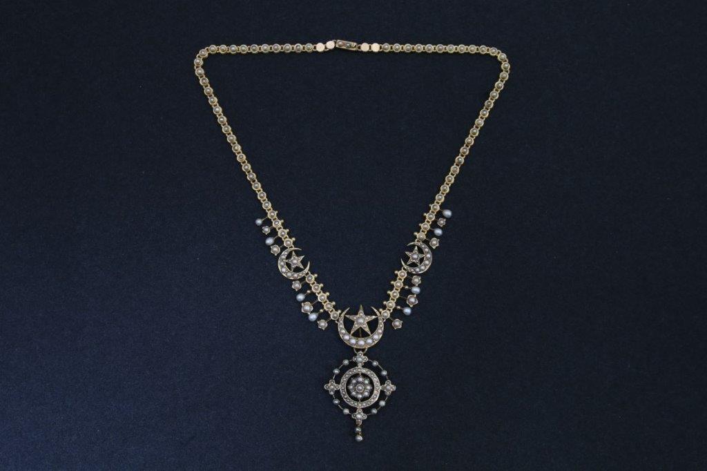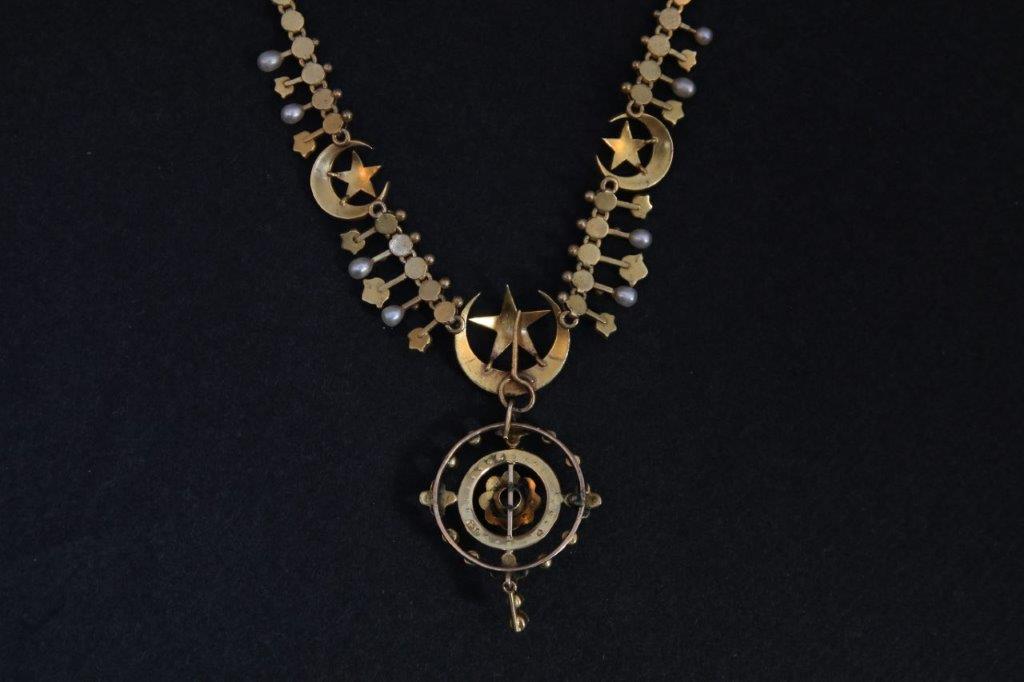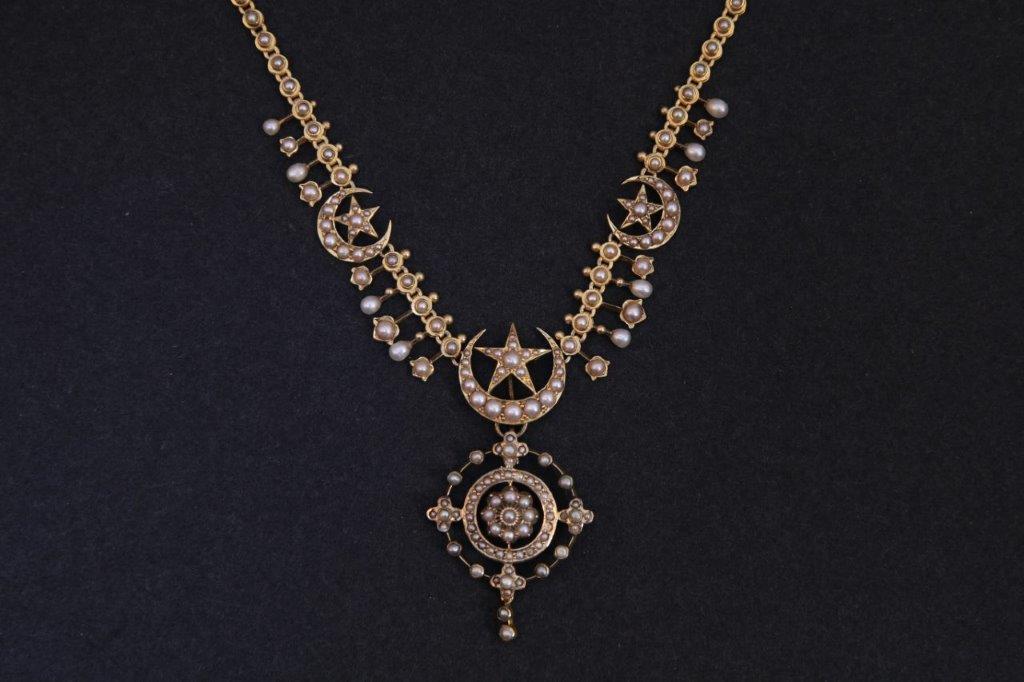 COLLIER ARTICULÉ en or jaune 375 millièmes, les maillons ornés de petites demi-perles de culture, le centre décoré de trois motifs croissant de lune et étoile retenant en pendentif ajouré également serti de demi-perles de culture.