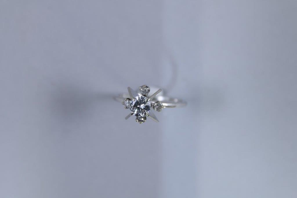 - Une BAGUE en or gris 750 millièmes ornée au centre d'un DIAMANT monté en griffes entouré en retrait de quatre petits brillants. Diam. du diamant central: 5 mm. TDD 50. Poids brut 2,4 g.
