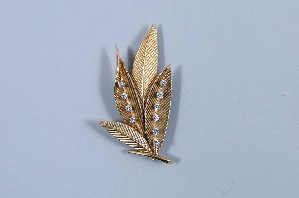 BROCHE FEUILLE en or jaune 750 millièmes à quatre feuilles ornées de 10 petits DIAMANTS.