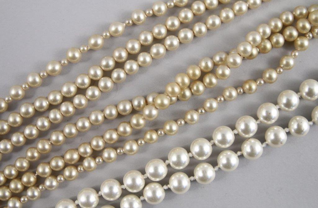 Deux COLLIERS de PERLES: le premier à un rang CHOKER (Long. 54 cm.), le second à trois rangs (Long. 45 cm, un rang à refixer).