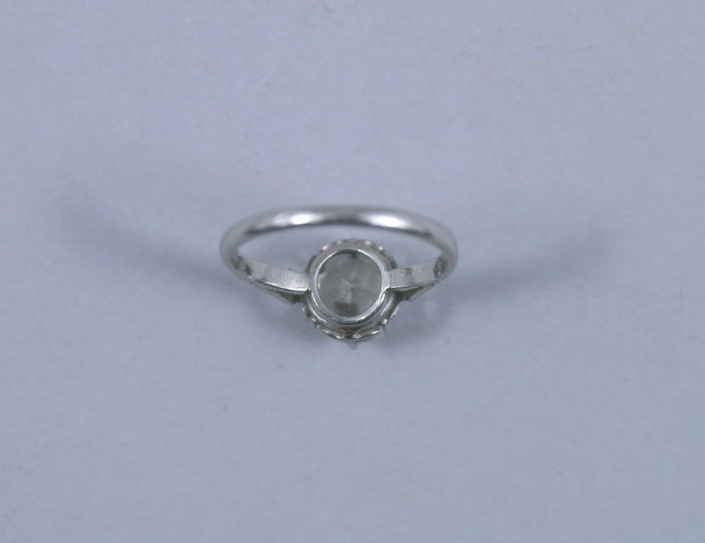 BAGUE en platine 850 millièmes ornée au centre d'un diamant rond de taille brillant (1,40/1,60 ct) entre six petits diamants taillés en rose.