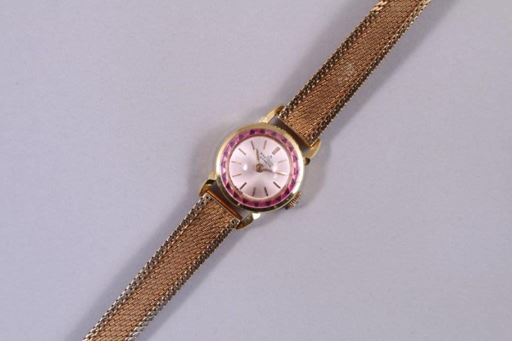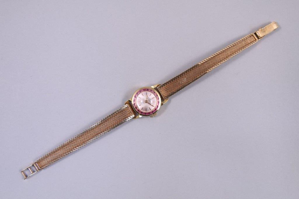 en or jaune 750 millièmes, la lunette sertie de pierres roses (RUBIS?), les heures marquées d'un bâton. Signée. Mouvement remontoir à trois heures. Le bracelet souple en or jaune 750 millièmes.