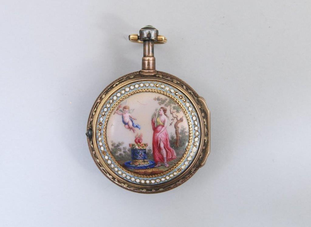 MONTRE de GOUSSET en or bas titre présentant une frise végétale et un rang de pierres blanches entourant un cadran émaillé indiquant les heures en chiffres romains, les minutes en chiffres arabes et cerclé d'un chemin fer. Les aiguilles en forme de fleur de lys et rinceaux. Le revers offrant un fin décor émaillé figurant une jeune femme près de Cupidon tenant le feu de l'Amour ; décor perlé sur fond bleu céleste. Bélière en or.