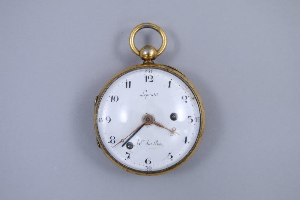 MONTRE en métal doré, le cadran signé LEPAUTE horloger du Roi. Elle figure les heures en chiffres arabes et présente deux remontoirs à 3h et 7h. Le boitier difficile à ouvrir.