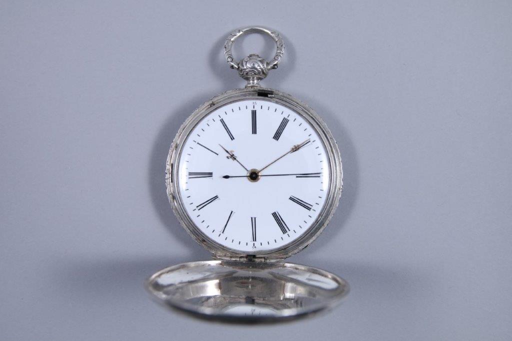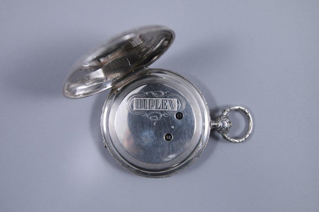 en argent de DUPLEX, Suisse, pour le marché chinois. Mouvement Duplex, échappement Jacot. Cadran émaillé blanc figurant les heures en chiffres arabes avec trotteuse, mouvement donnant l'impression de "battre la seconde".