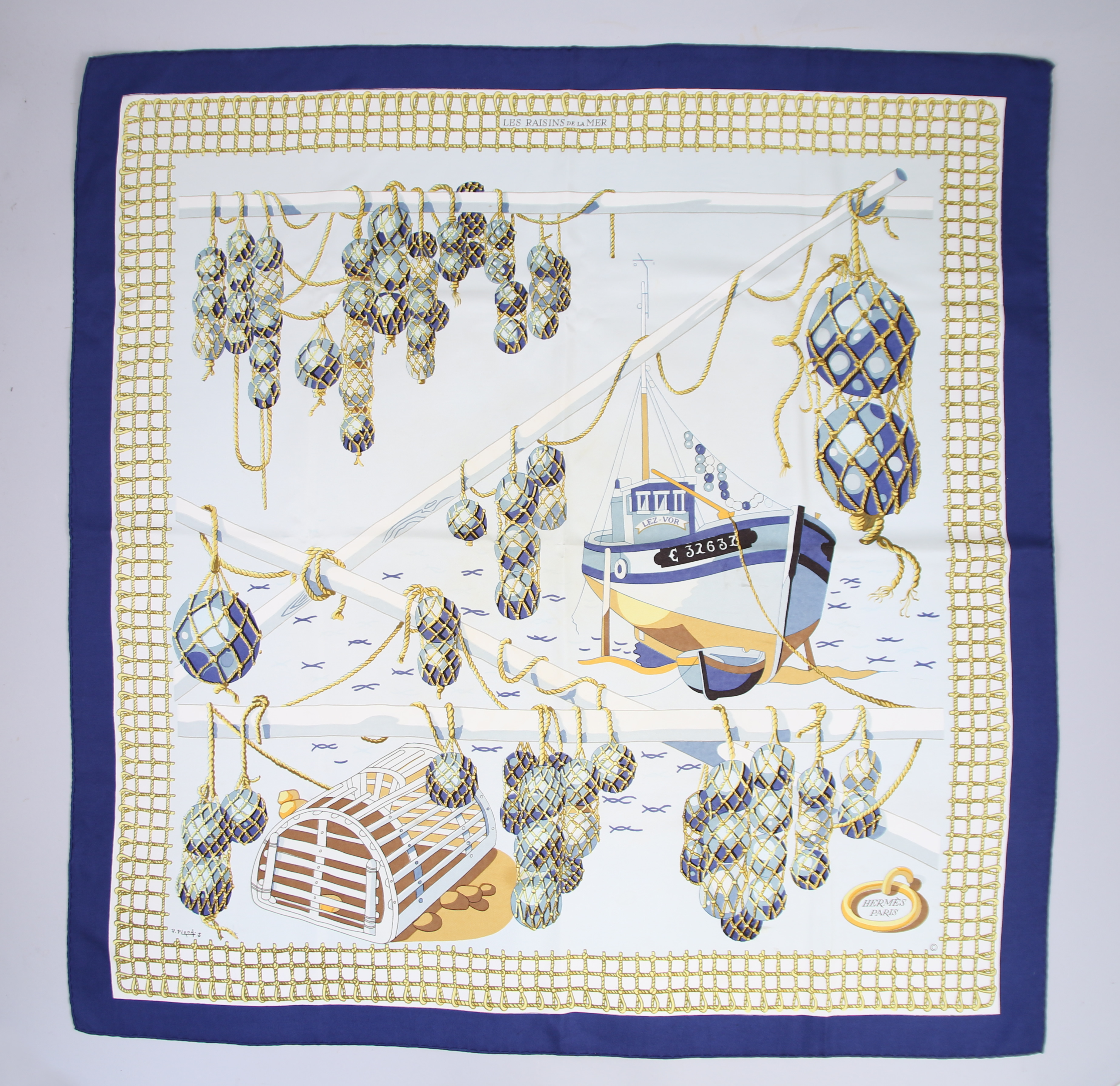 HERMES. CARRÉ en soie "LES RAISINS DE LA MER" à fond blanc à bordure bleue. Modèle créé par Peron.