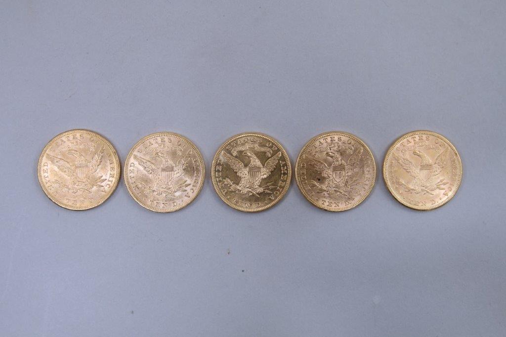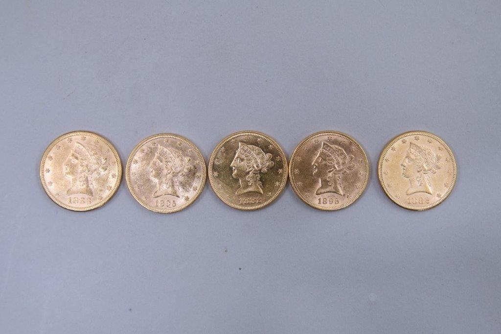ÉTATS-UNIS. 5 PIÈCES 10 DOLLARS OR. 2 x 1882, 1 x 1883, 2 x 1895.