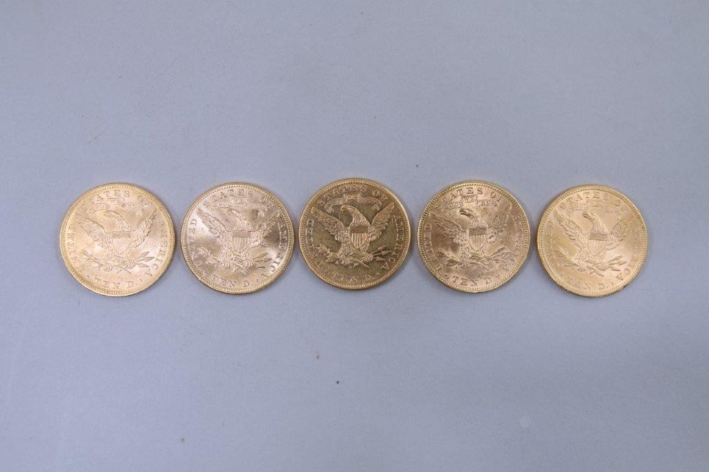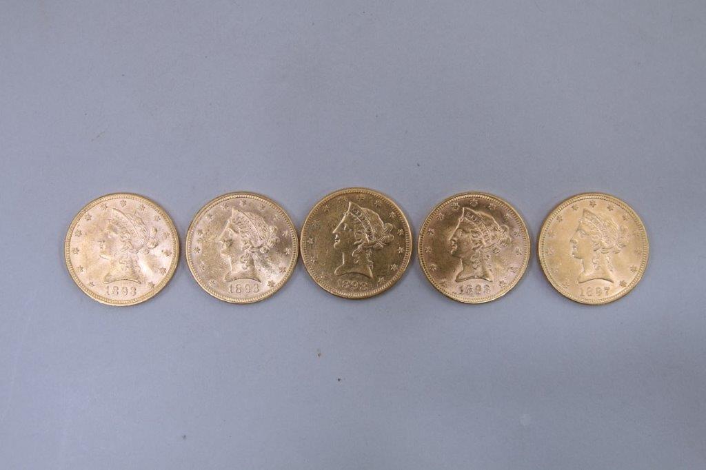 ÉTATS-UNIS. 5 PIÈCES 10 DOLLARS OR. 4 x 1893, 1 x 1897.
