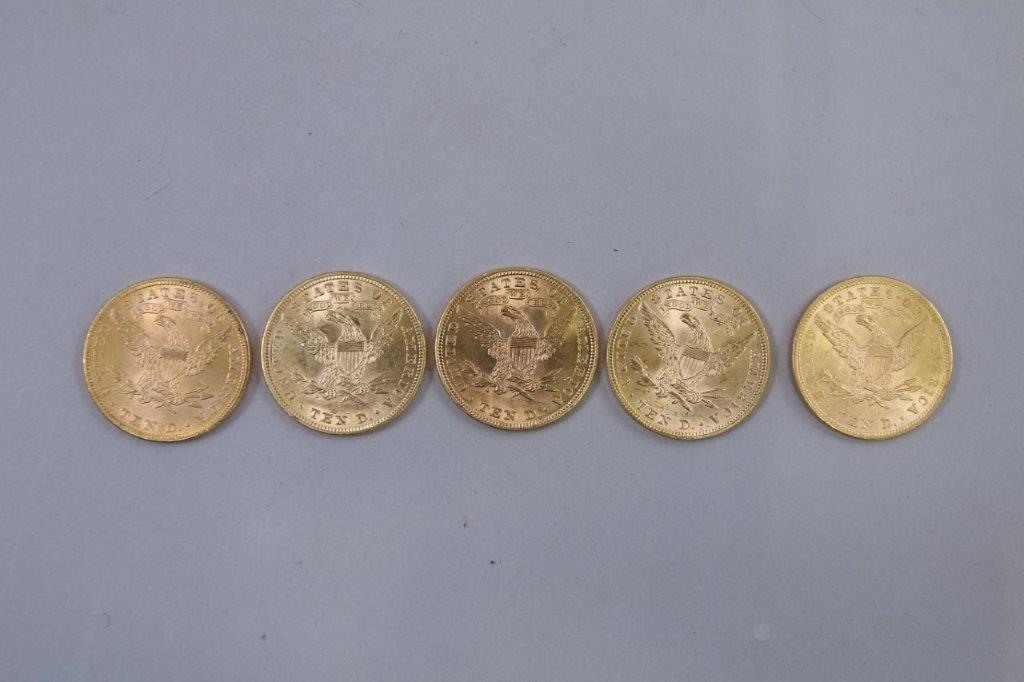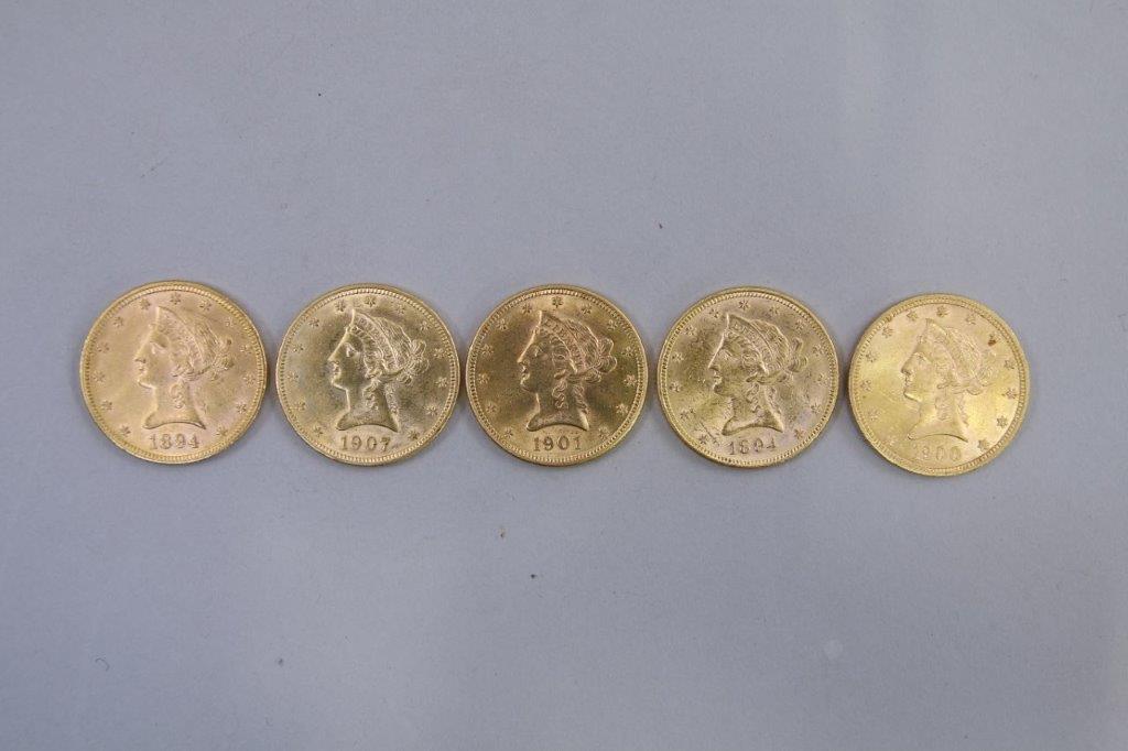 ÉTATS-UNIS. 5 PIÈCES 10 DOLLARS OR. 2 x 1894, 1 x 1900, 1 x 1901, 1 x 1907.