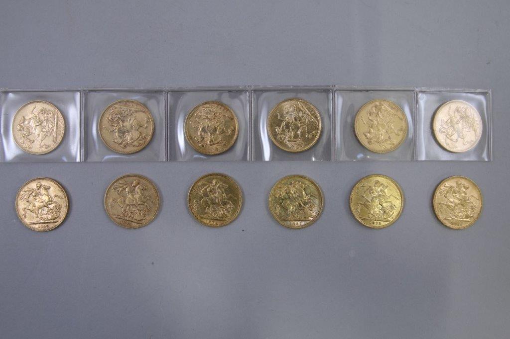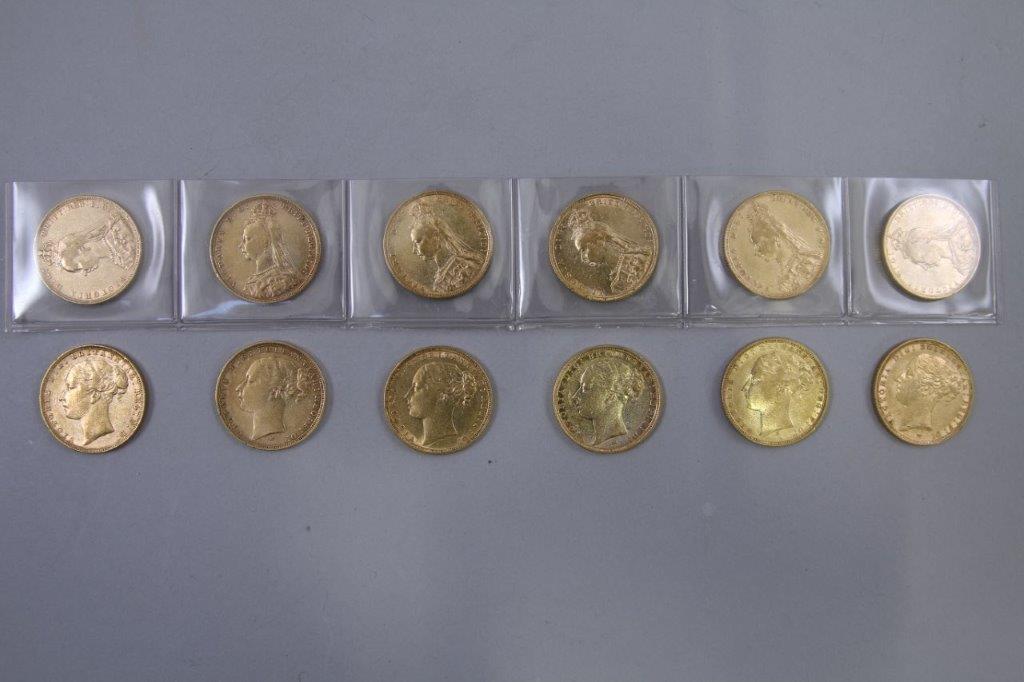 ANGLETERRE. 12 PIÈCES 1 SOUVERAIN OR. Reine Victoria. 1 x 1871, 1 x 1873, 1 x 1880, 1 x 1882, 1 x 1885, 1 x 1887, 1 x 1889, 1 x 1890, 3 x 1892, 1 x 1898.