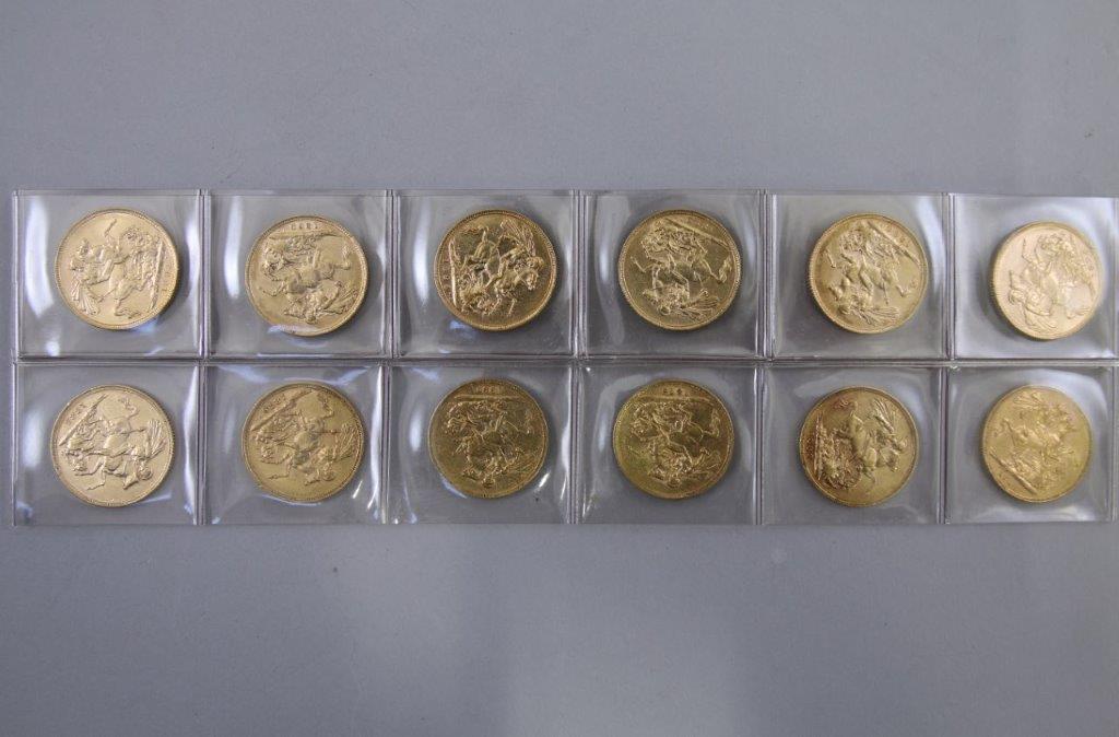 ANGLETERRE. 12 PIÈCES 1 SOUVERAIN OR. Reine Victoria. 1 x 1876, 1 x 1879, 1 x 1880, 1 x 1882, 1 x 1885, 1 x 1886, 3 x 1893, 2 x 1894, 1 x 1900.
