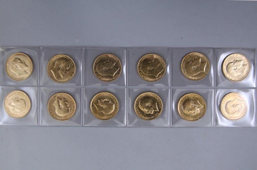 ANGLETERRE. 12 PIÈCES 1 SOUVERAIN OR. Georges V. 1 x 1904, 1 x 1907, 1 x 1908, 3 x 1910, 2 x 1911, 1 x 1914, 1 x 1918, 1 x 1927, 1 x 1929.