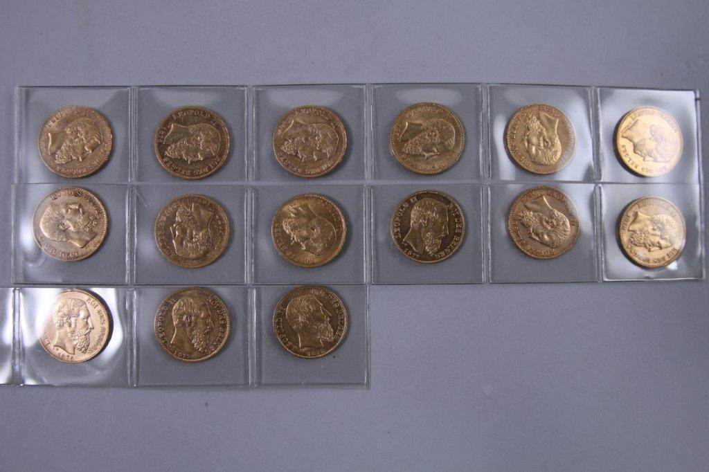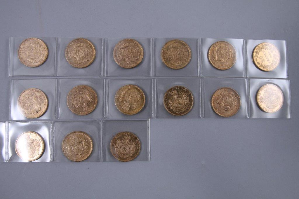BELGIQUE. 15 PIÈCES 20 FRANCS OR. Léopold I (1 x 1865), Léopold II (1 x 1867, 1 x 1868, 2 x 1870, 1 x 1875, 2 x 1876, 6 x 1877, 1 x 1878).