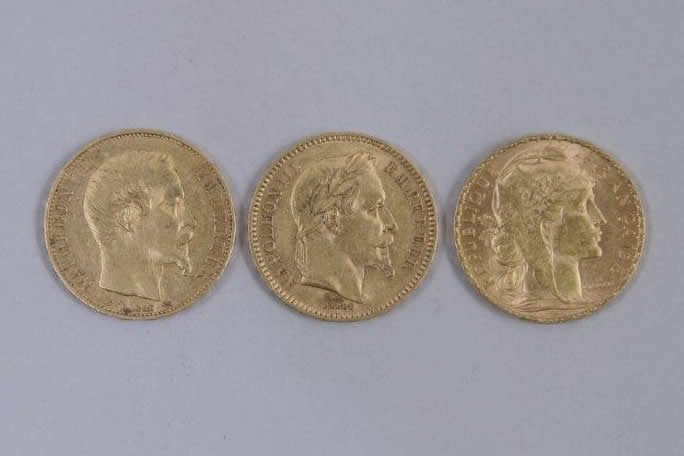 FRANCE. 3 PIÈCES 20 FRANCS OR. Napoléon III non lauré (1 x 1860), lauré (1 x 1865), RF Coq (1 x 1907).