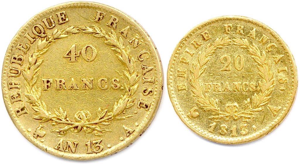 40 Francs (tête nue) an 13 Paris et 20 Francs (tête laurée) 1813 Paris.