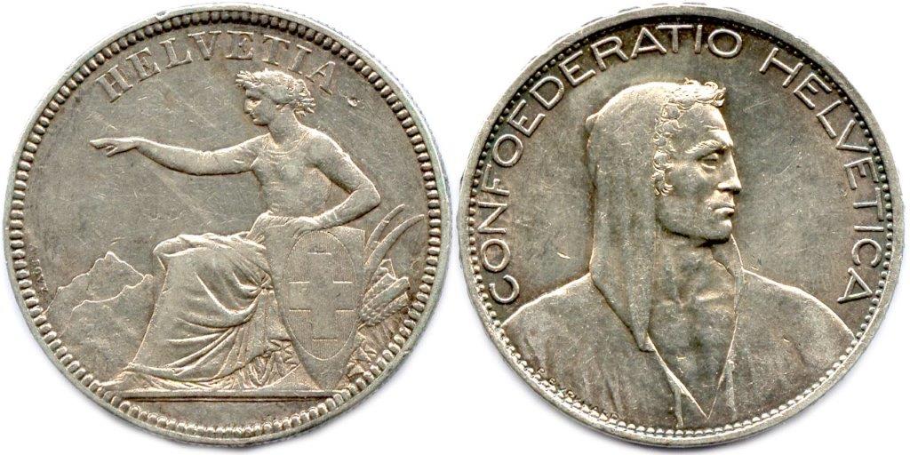LOT de deux monnaies en argent Suisse :5 Francs Helvetia...
