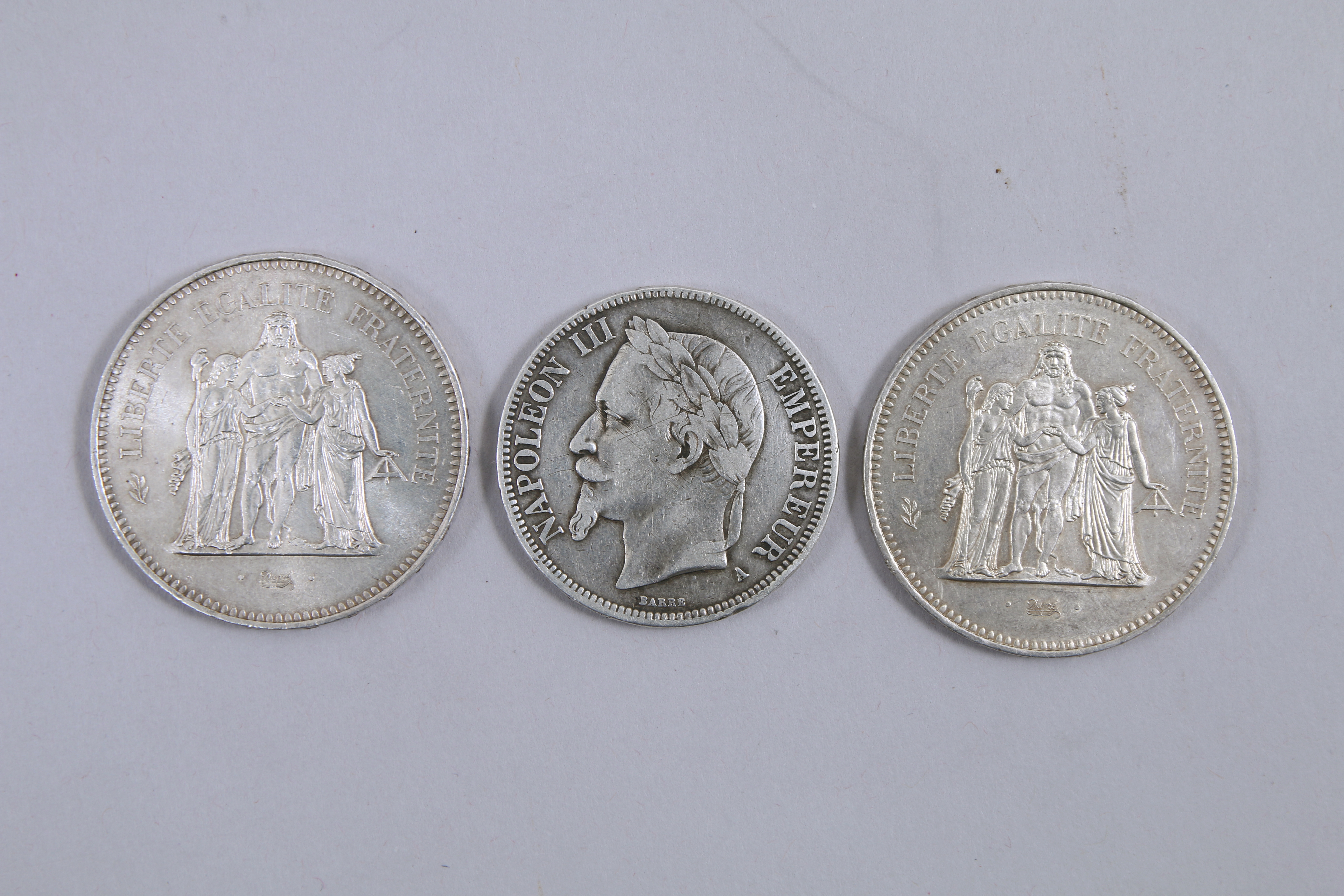 FRANCE. 3 pièces en argent: 2 x 50 francs Hercule 1978, 1 x 5 francs Napoléon III 1867.