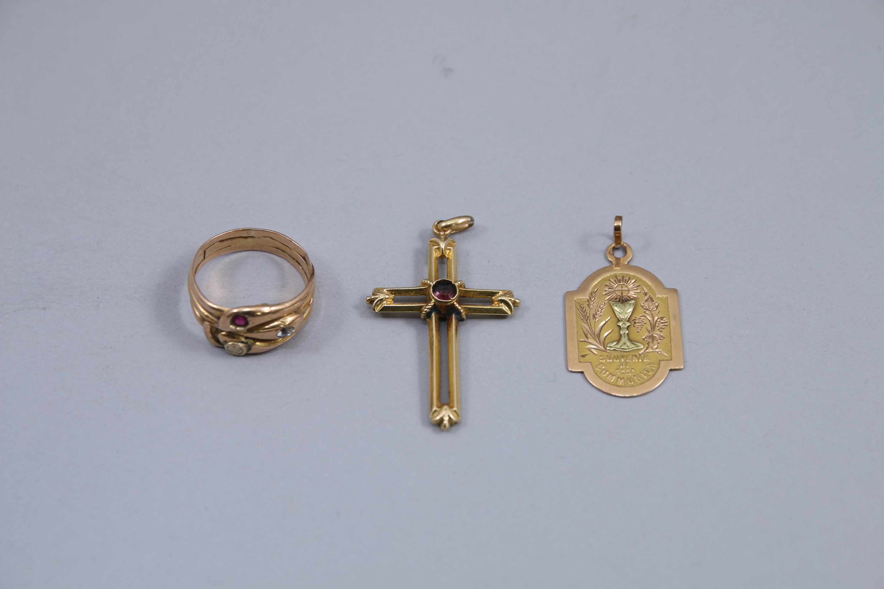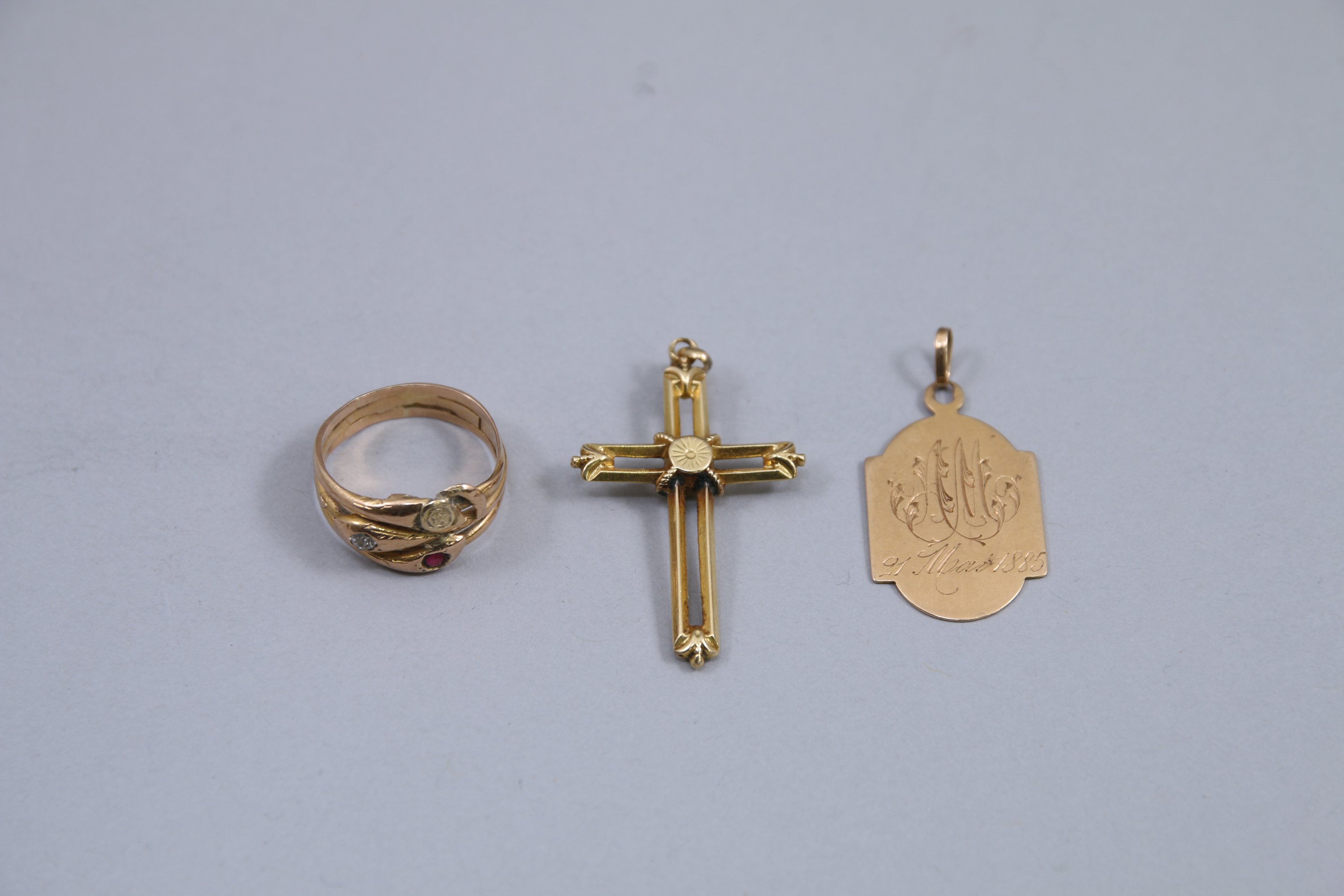 Deux PENDENTIFS et une BAGUE en or jaune 750 millièmes:
