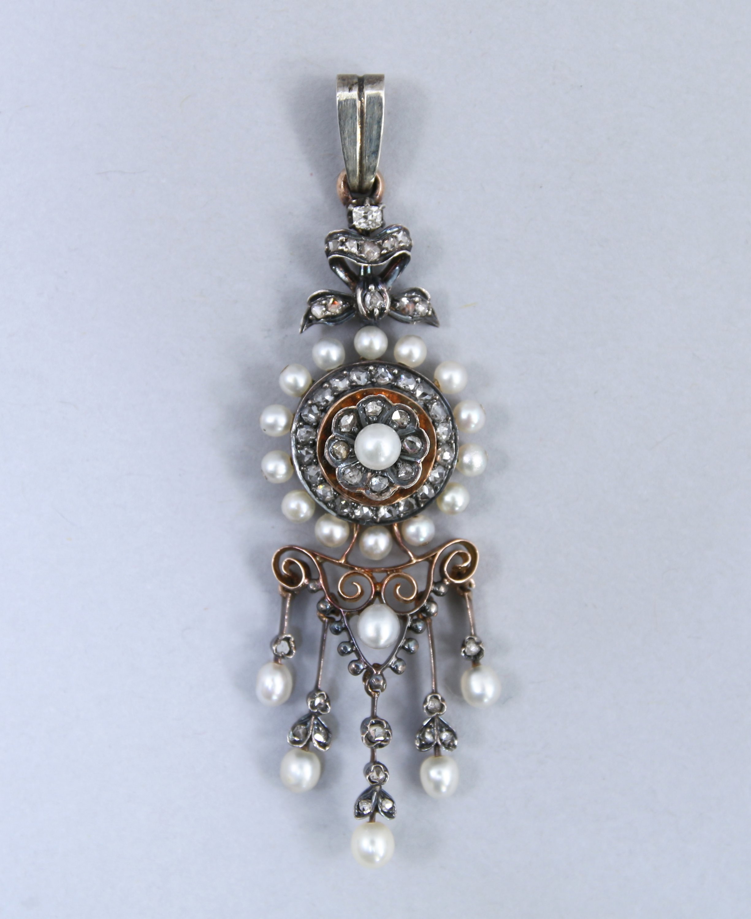 PENDENTIF en or 375 millièmes, métal, perles et brillants. La partie supérieure ornée d'un noeud prenant appui sur une rosace présentant au centre motif de fleurs épanoui dont le centre offre une perle. La partie inférieure ornée de quatre pampilles se terminant chacune par des perles.