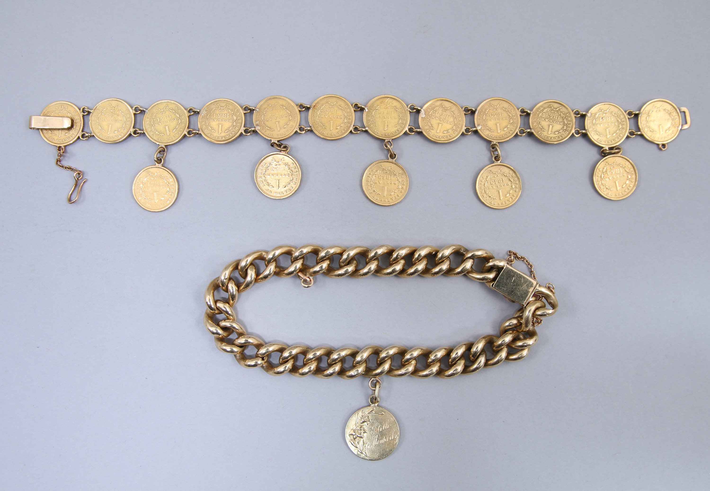 Deux BRACELETS en or jaune 750 millièmes, le premier orné de dix-sept PIÈCES de UN DOLLAR (1851-1854) de diverses années (1851 X 3, 1852 X 1, 1853 X 7, 1854 X 3, 2 illisibles), le second à mailles, orné d'une médaille de la Vierge par Emile Dropsy. Le fermoir à chainette de sécurité.
