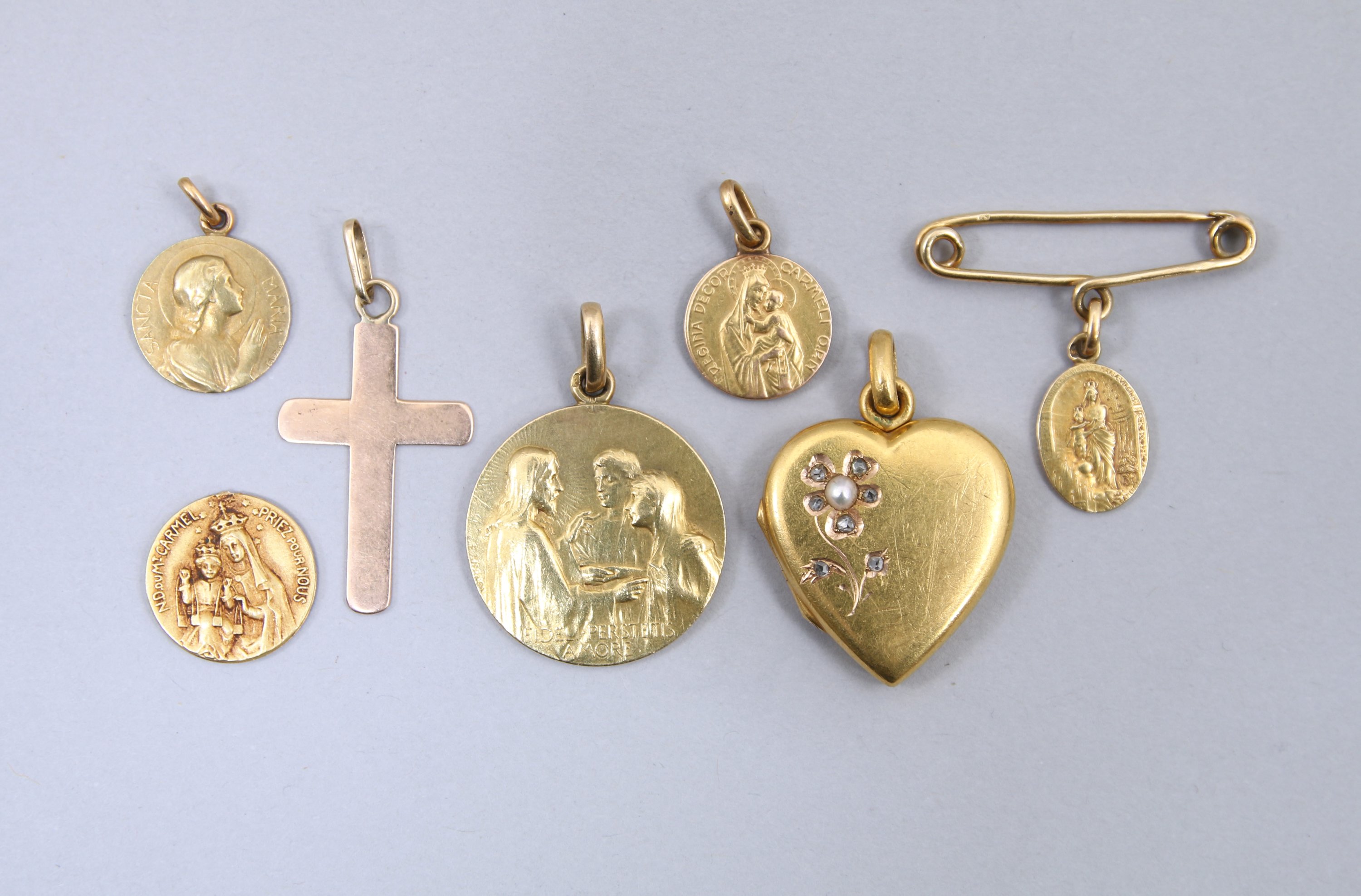 Cinq MÉDAILLES et deux PENDENTIFS en or jaune 750 millièmes, dont