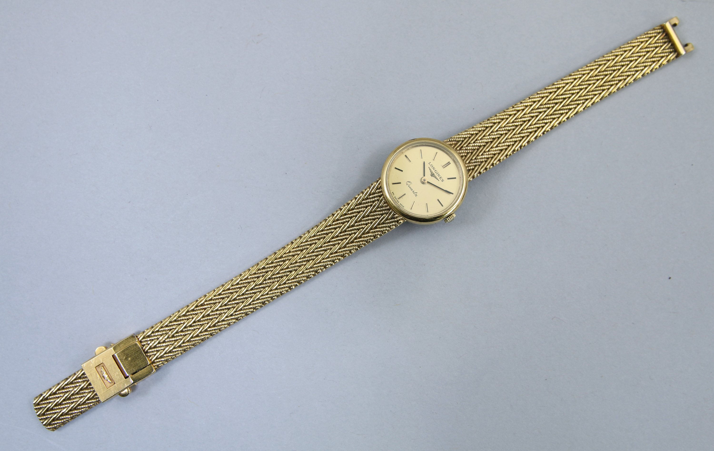 LONGINES. MONTRE BRACELET de dame en métal doré. Le cadran de forme circulaire indiquant les heures par des bâtonnets. Mouvement à quartz.