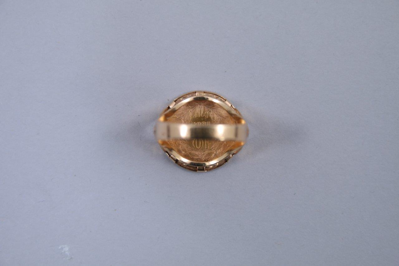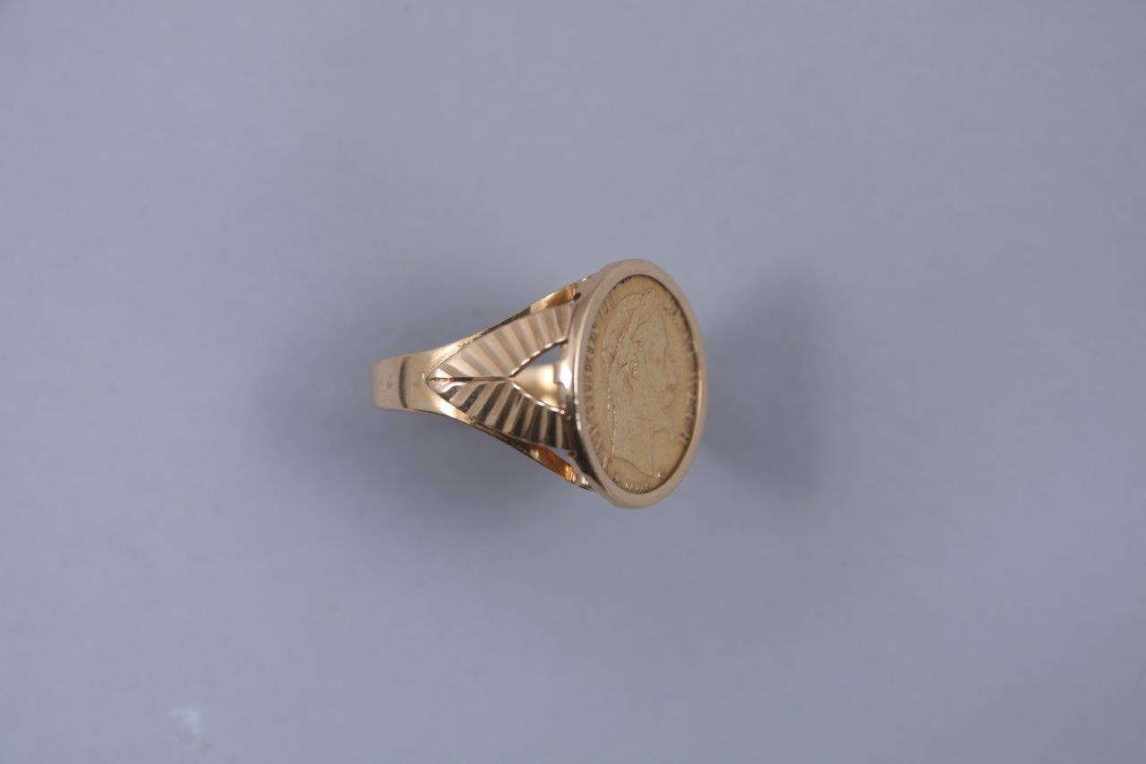 BAGUE en or 750 millièmes ornée au centre d'une pièce de 10 FRANCS OR NAPOLÉON III lauré (1864). L'épaule à décor de feuille stylisée.