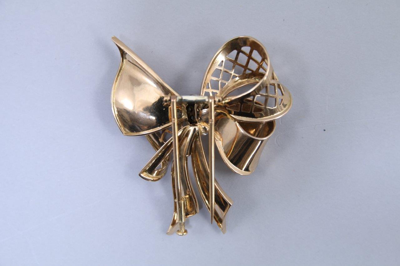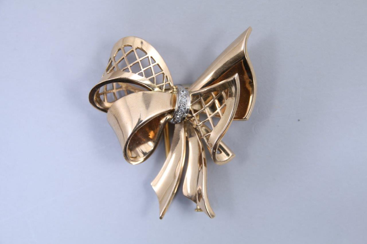Large BROCHE NOEUD en or jaune 750 millièmes pavée de quatre petits DIAMANTS.