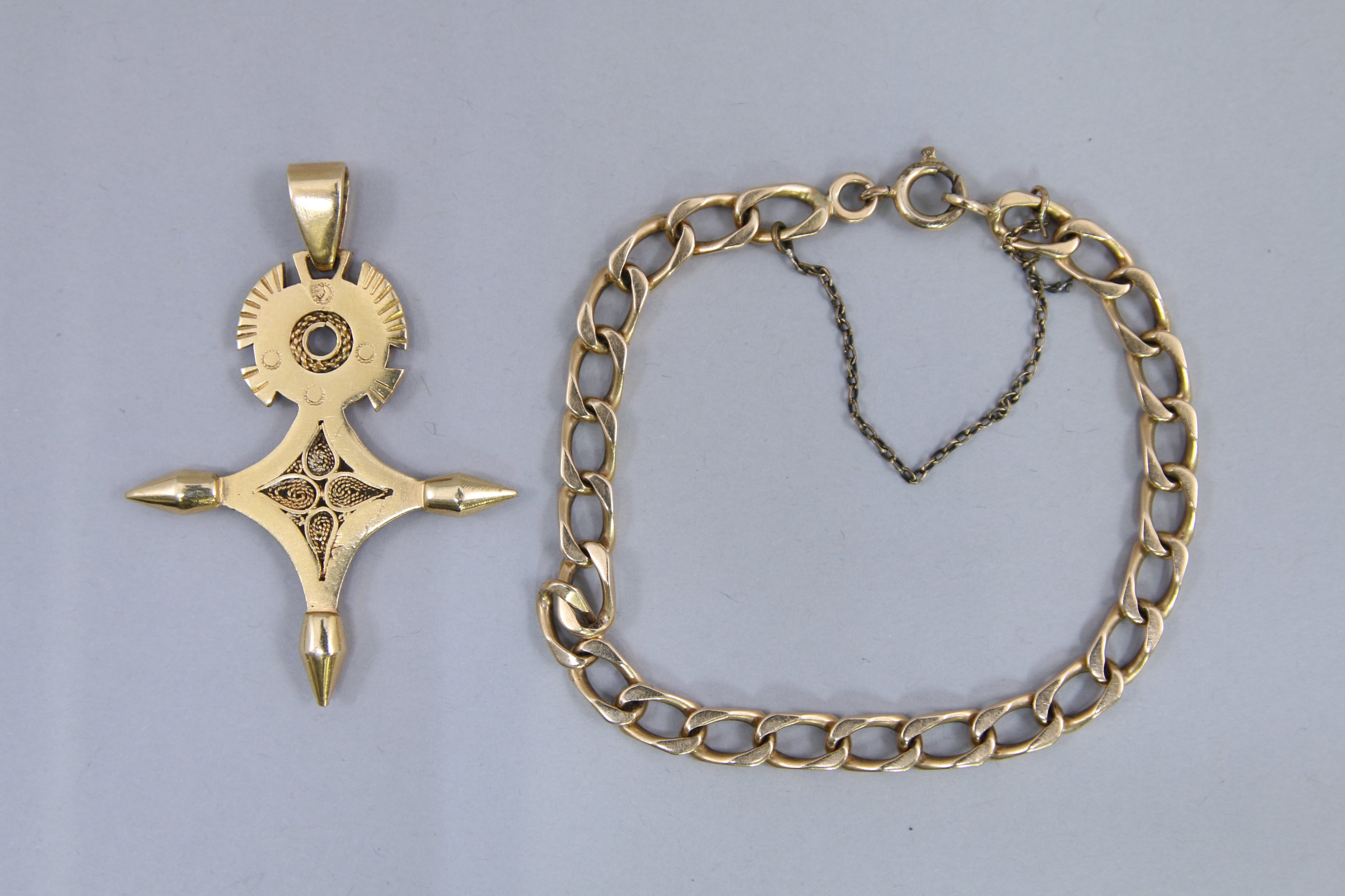 LOT comprenant un BRACELET maille gourmette en or jaune 750 millièmes avec sa sécurité et un PENDENTIF en or jaune 750 millièmes (à charge de contrôle) figurant une croix berbère.