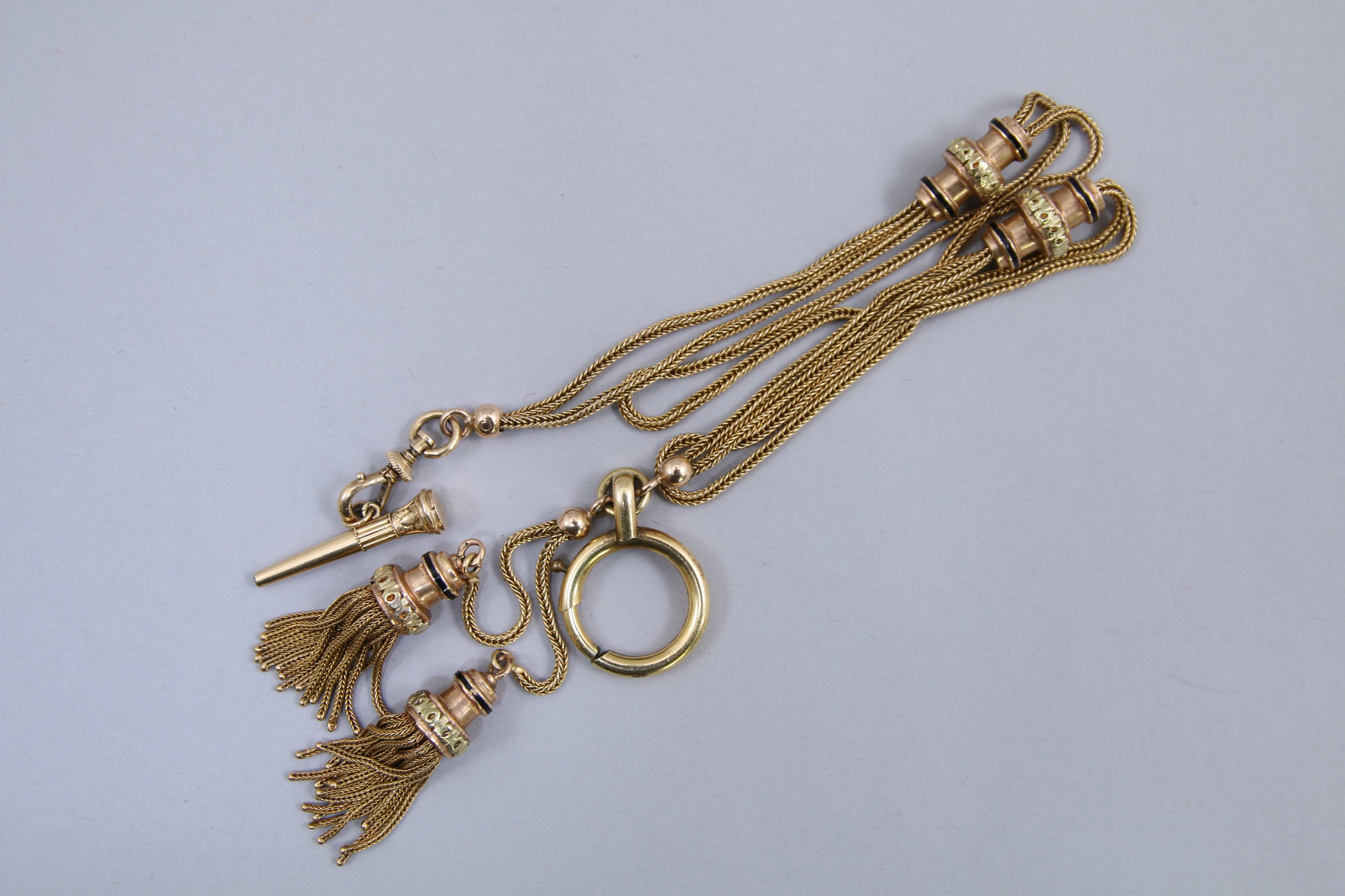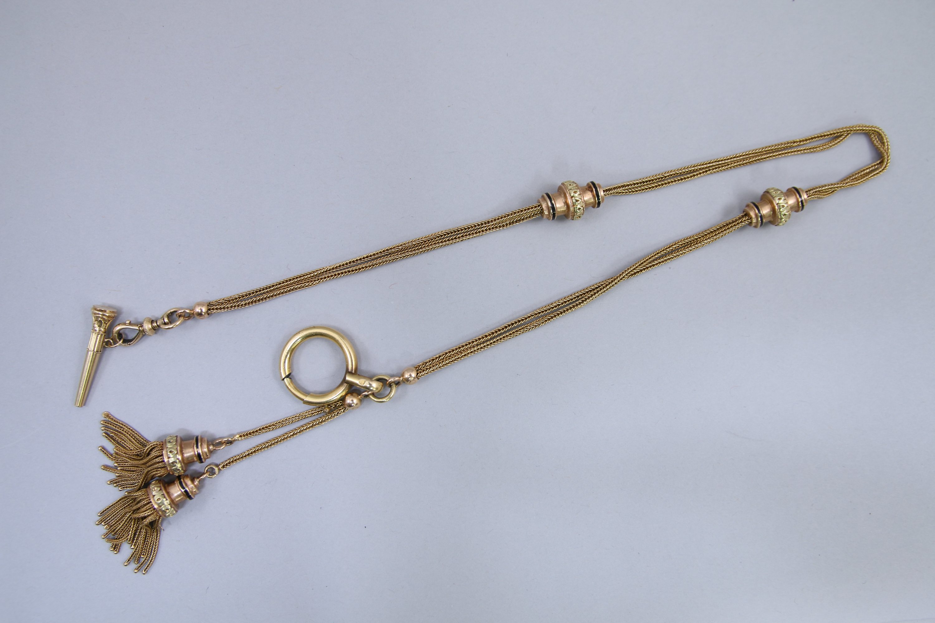 CHAÎNE de MONTRE en or jaune et rose 750 millièmes, clef de remontoir, deux poulies et pendentif en passementerie. Poinçon: tête d’aigle.