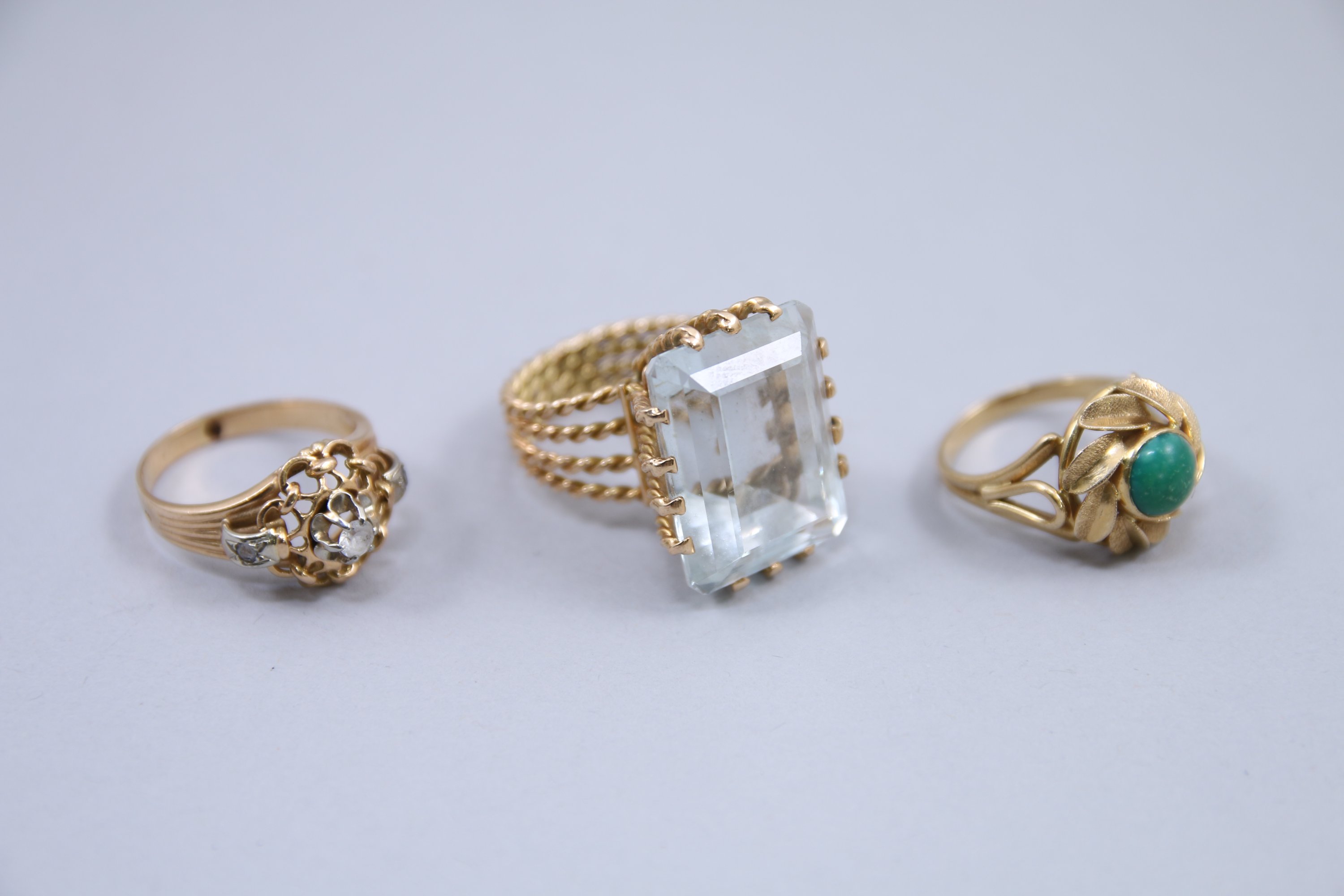 Trois BAGUES en or jaune 750 millièmes. La première ornée d’une importante pierre blanche style cristal de roche (20 mm de long) montée en griffes. La seconde ornée d’un cabochon de pierre verte imitant une fleur épanouie. La troisième ornée de trois pierres blanches montées en griffes.