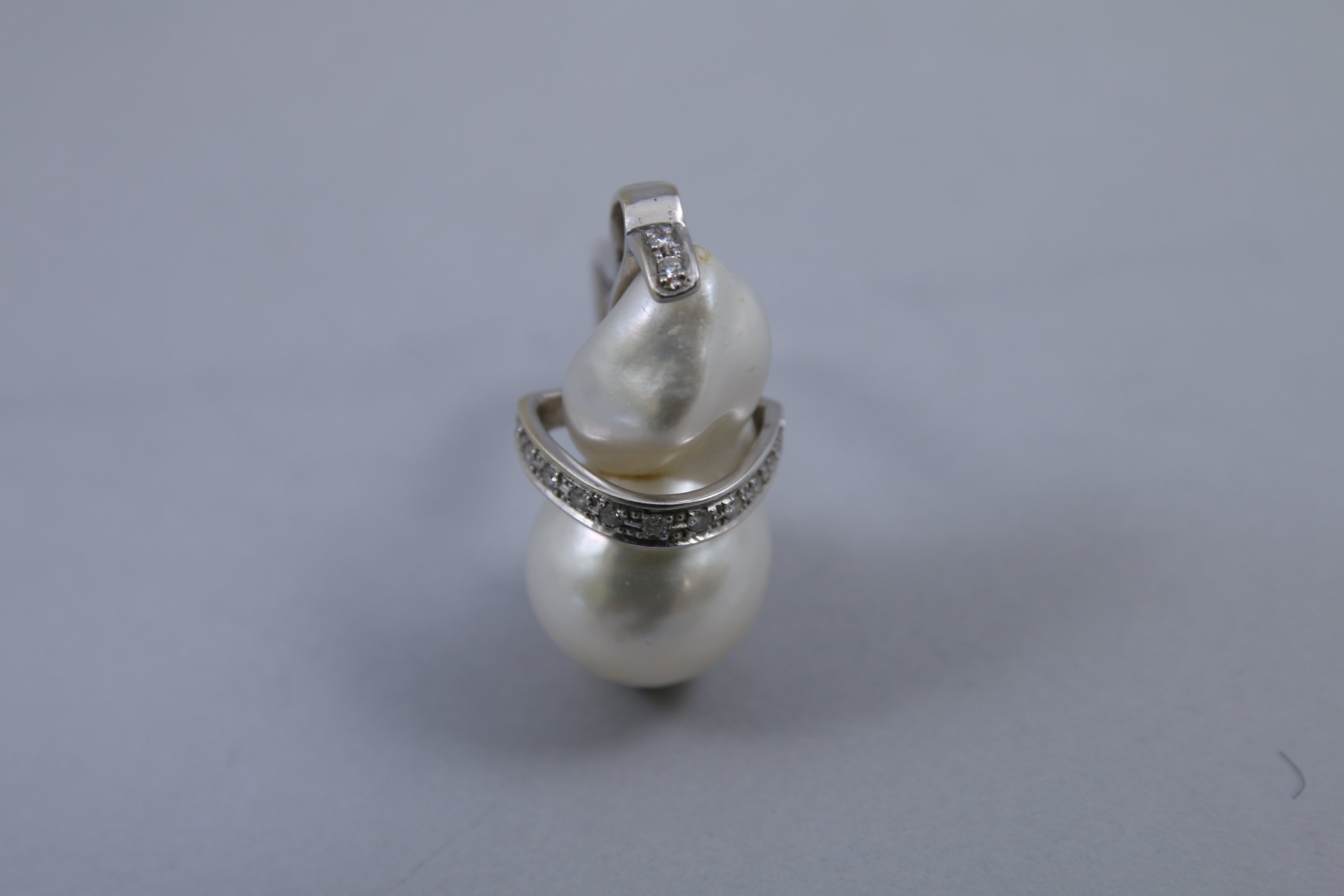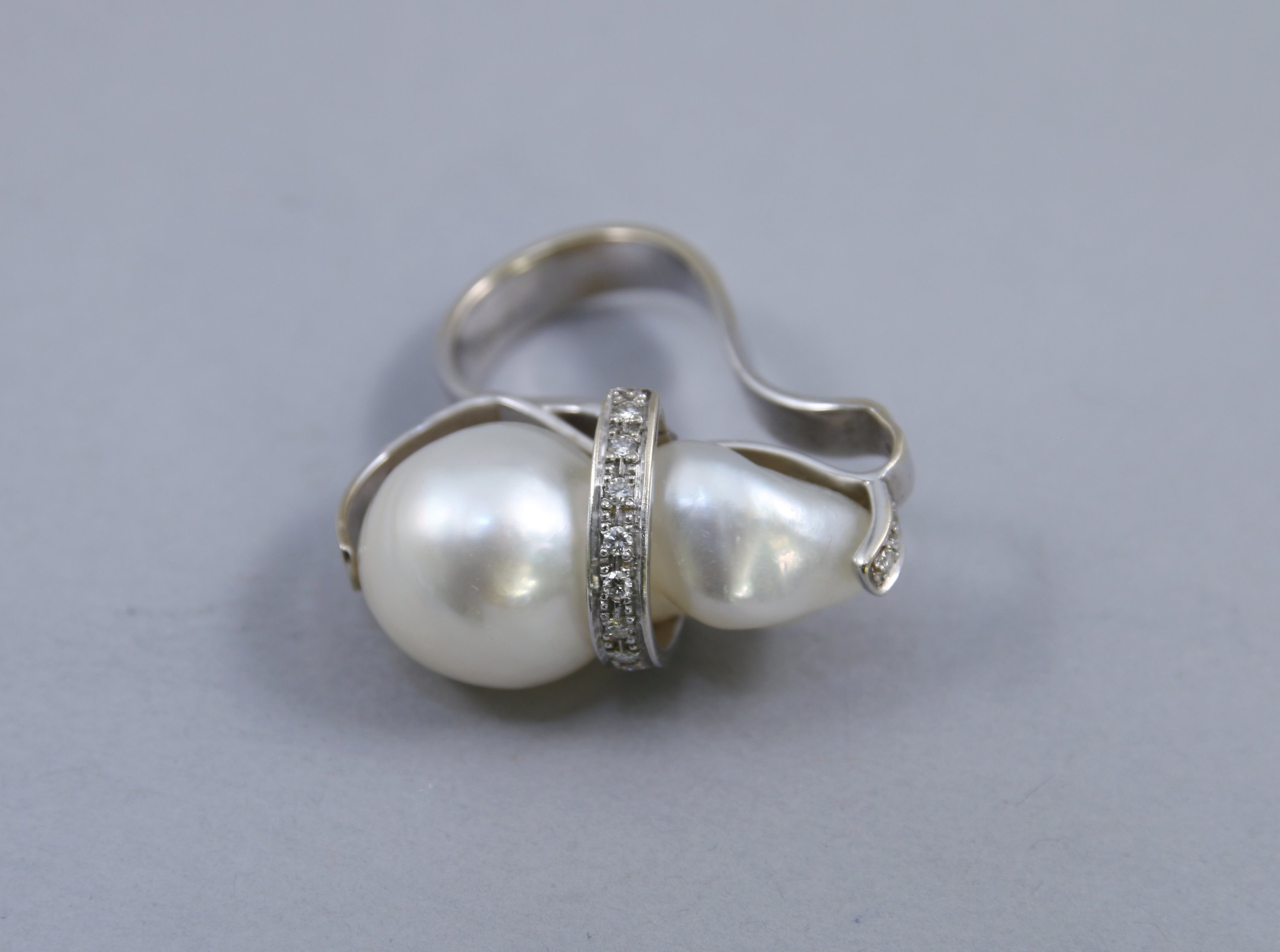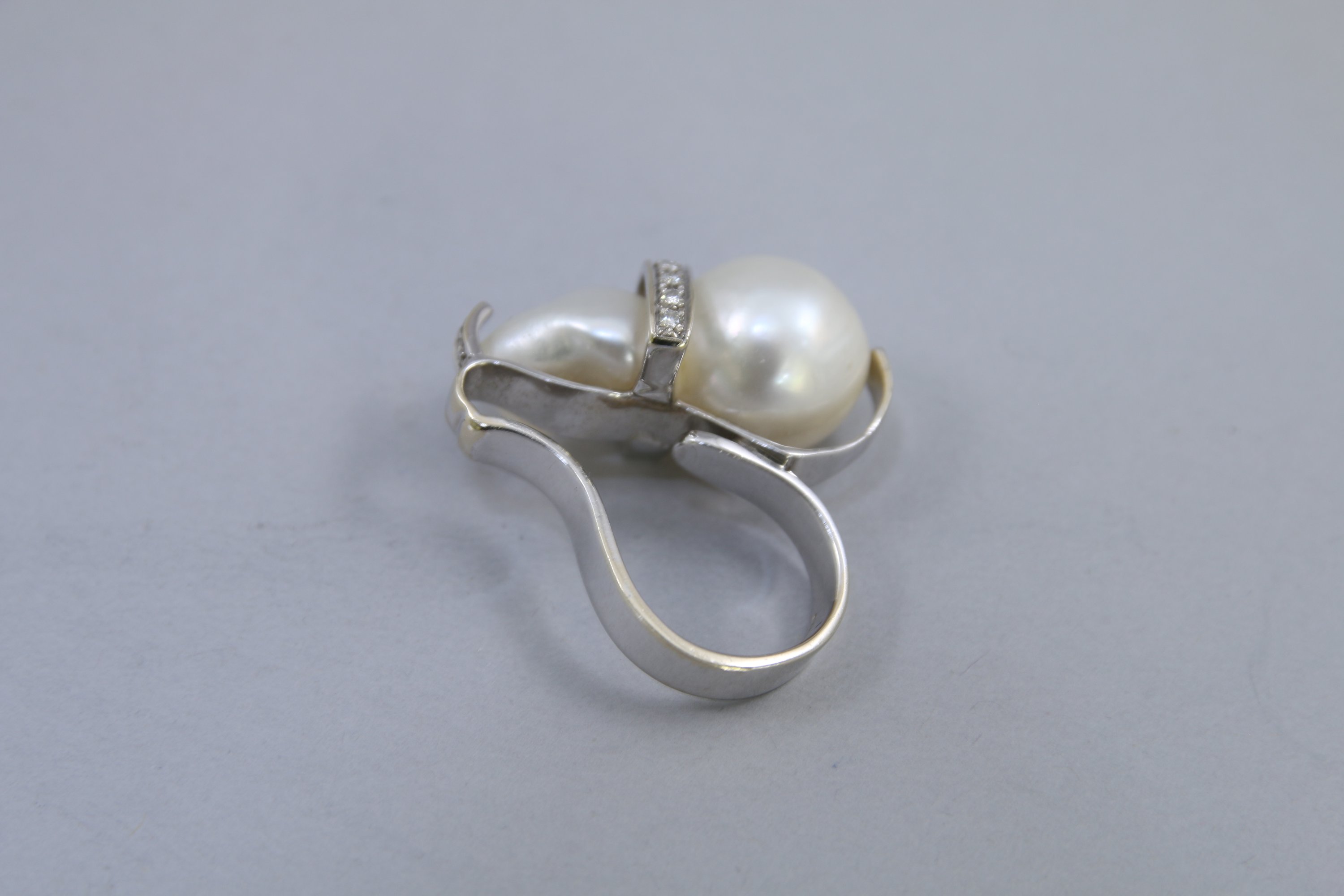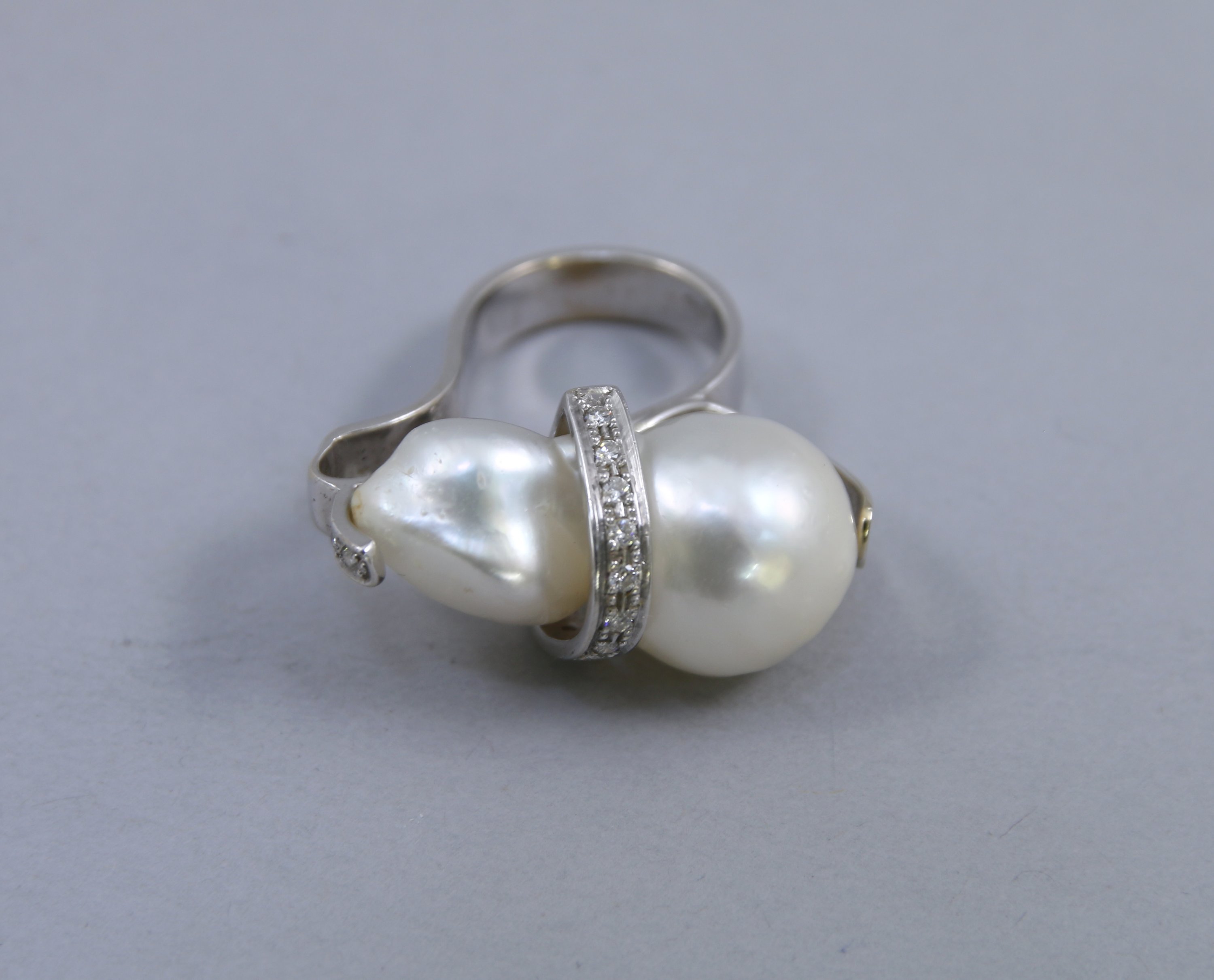 BAGUE en or gris 750 millièmes, ornée d’une perle baroque. La perle enchâssée dans une monture en courbe et contrecourbe sertie de diamants et pierres blanches.