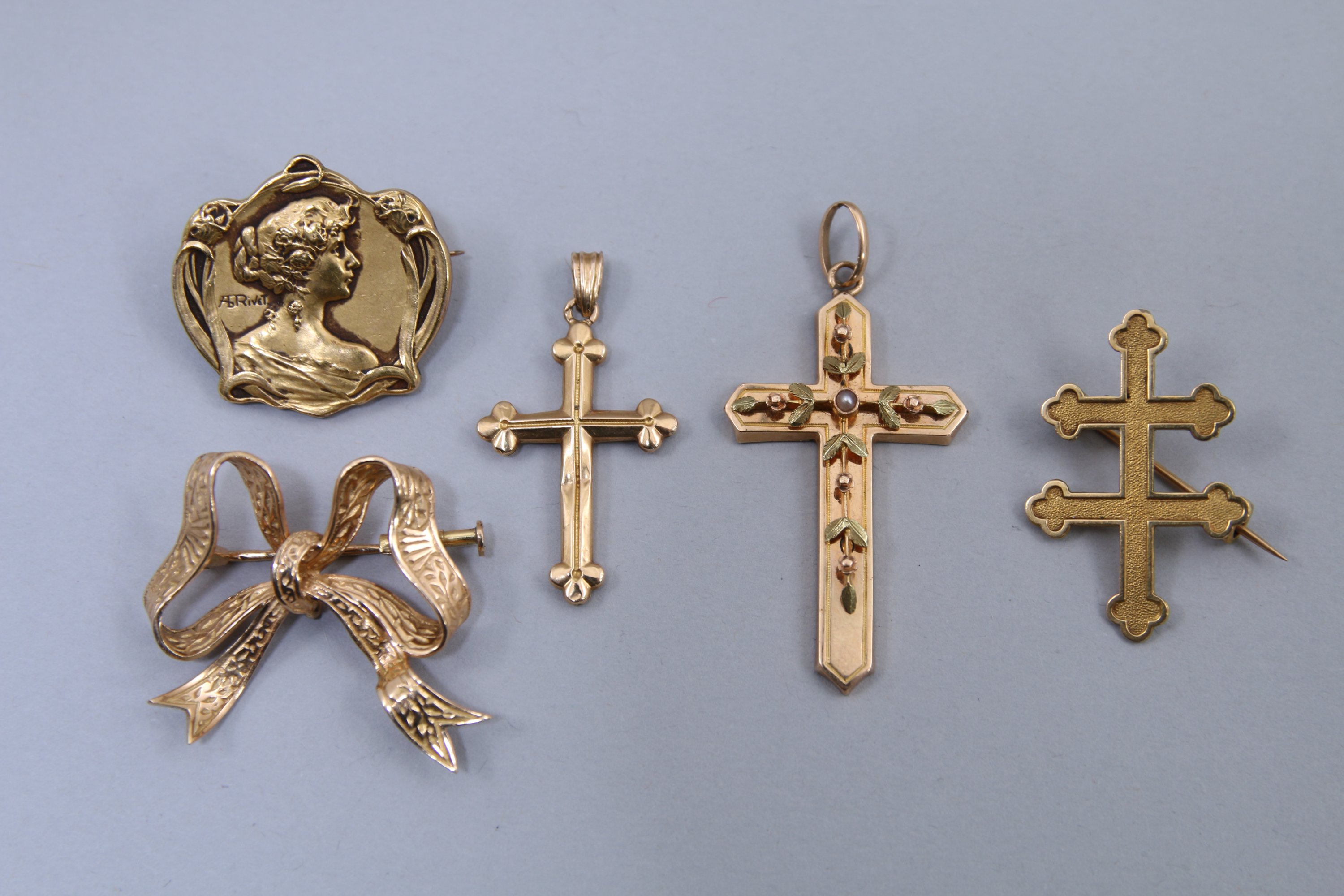 Lot de DEUX PENDENTIFS et TROIS BROCHES en or jaune 750 millièmes. Comprenant deux croix, une croix de lorraine, un ruban et un profil de femme. Une croix ornée d'une semence de perle.