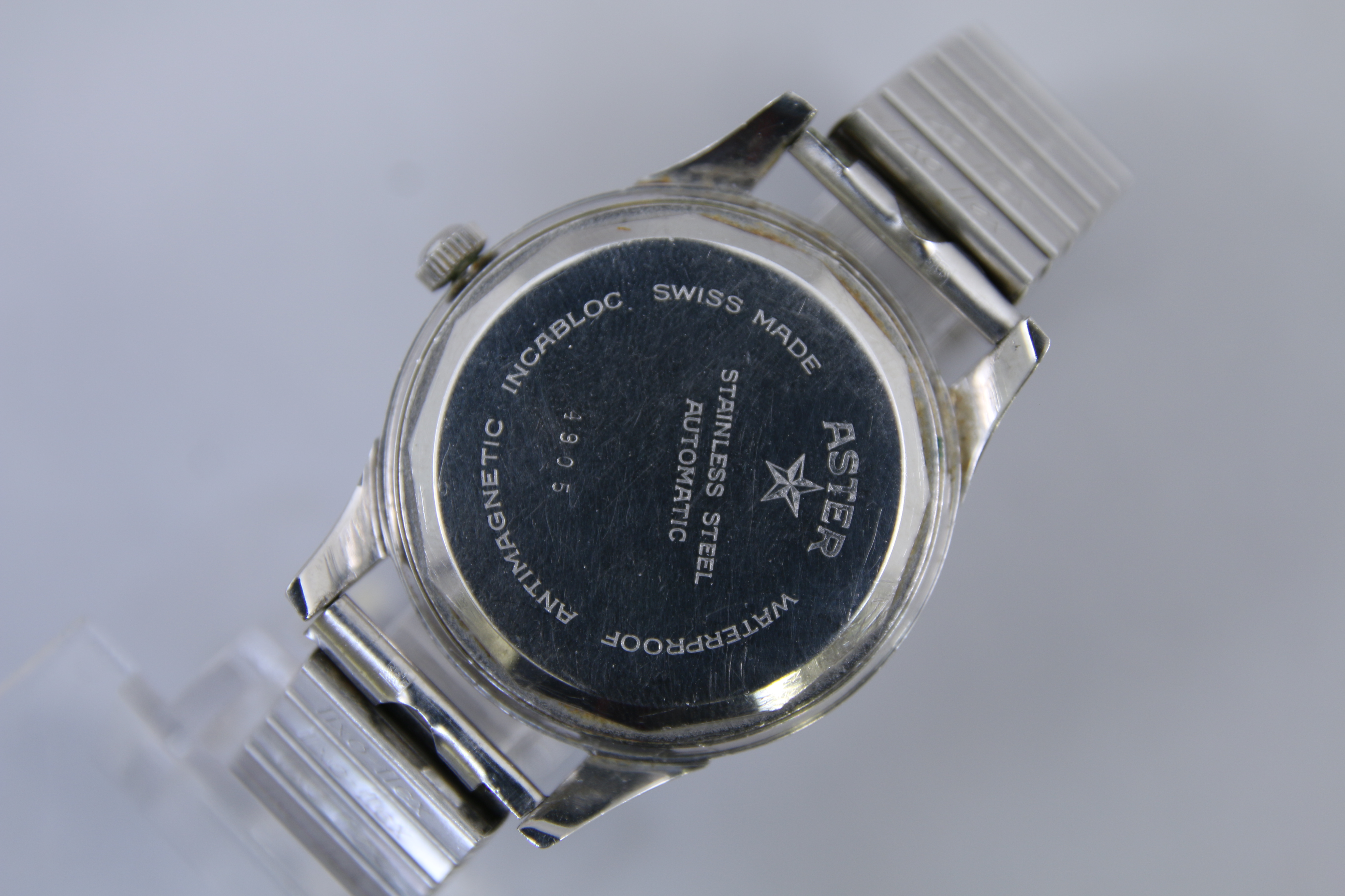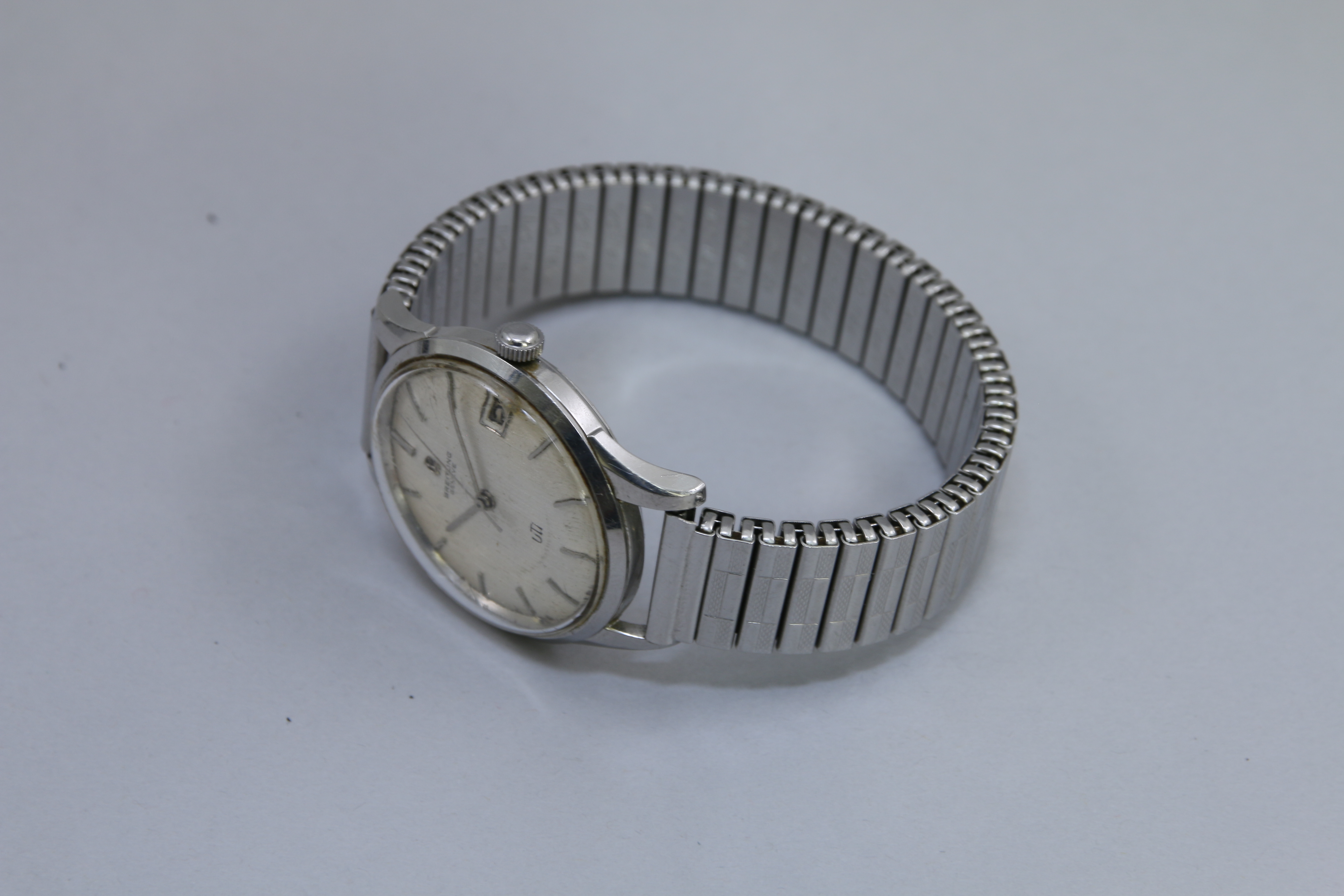Montre bracelet en acier la date dans un guichet à trois heures. Bracelet en acier à maille extensible. Mouvement automatique. Circa 1960. Type Transocéan.