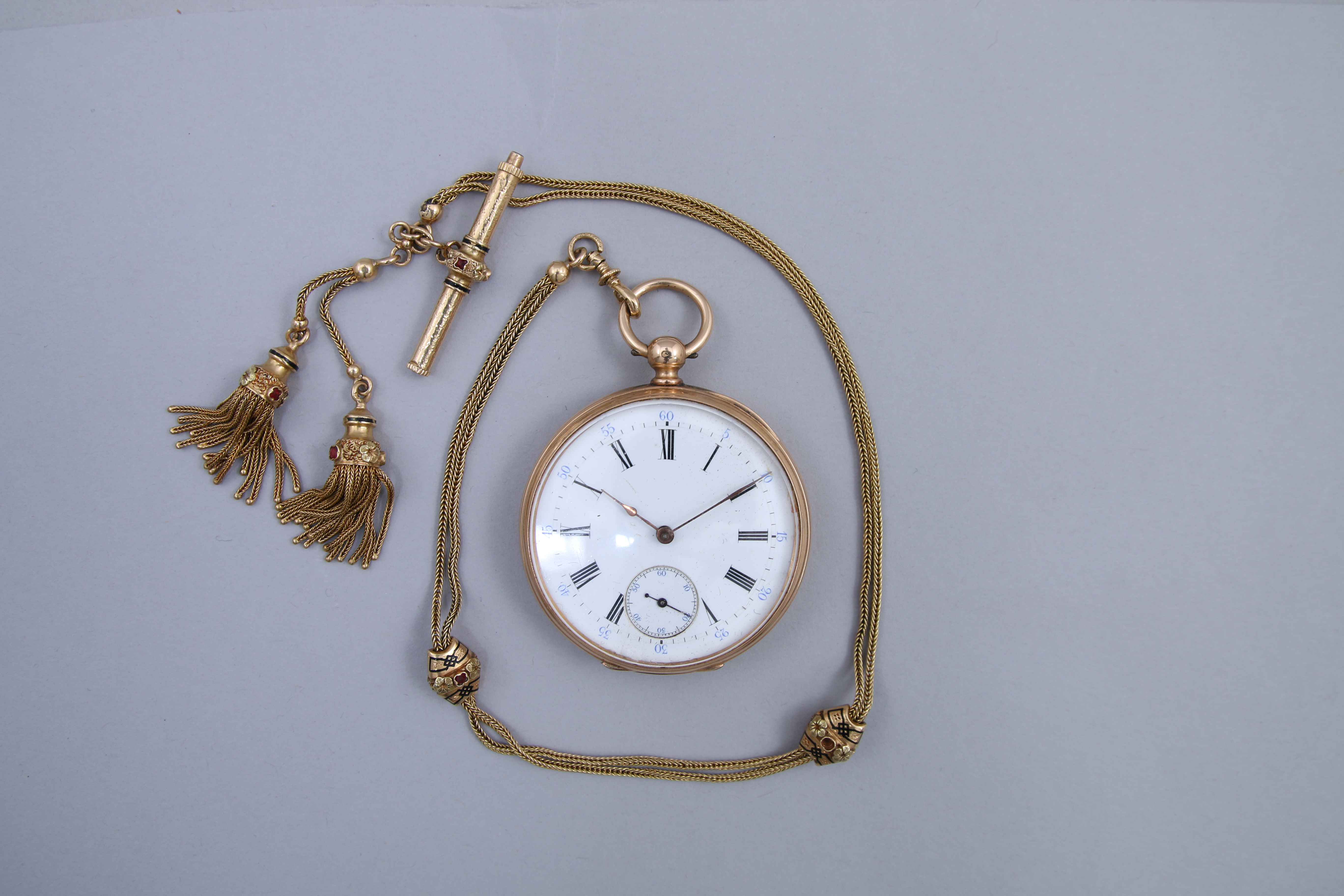 Avec sa double CHAÎNE et sa CLEF en or jaune 750 millièmes. Ornée de poulies et passementeries. Sertie de petites pierres rouges.