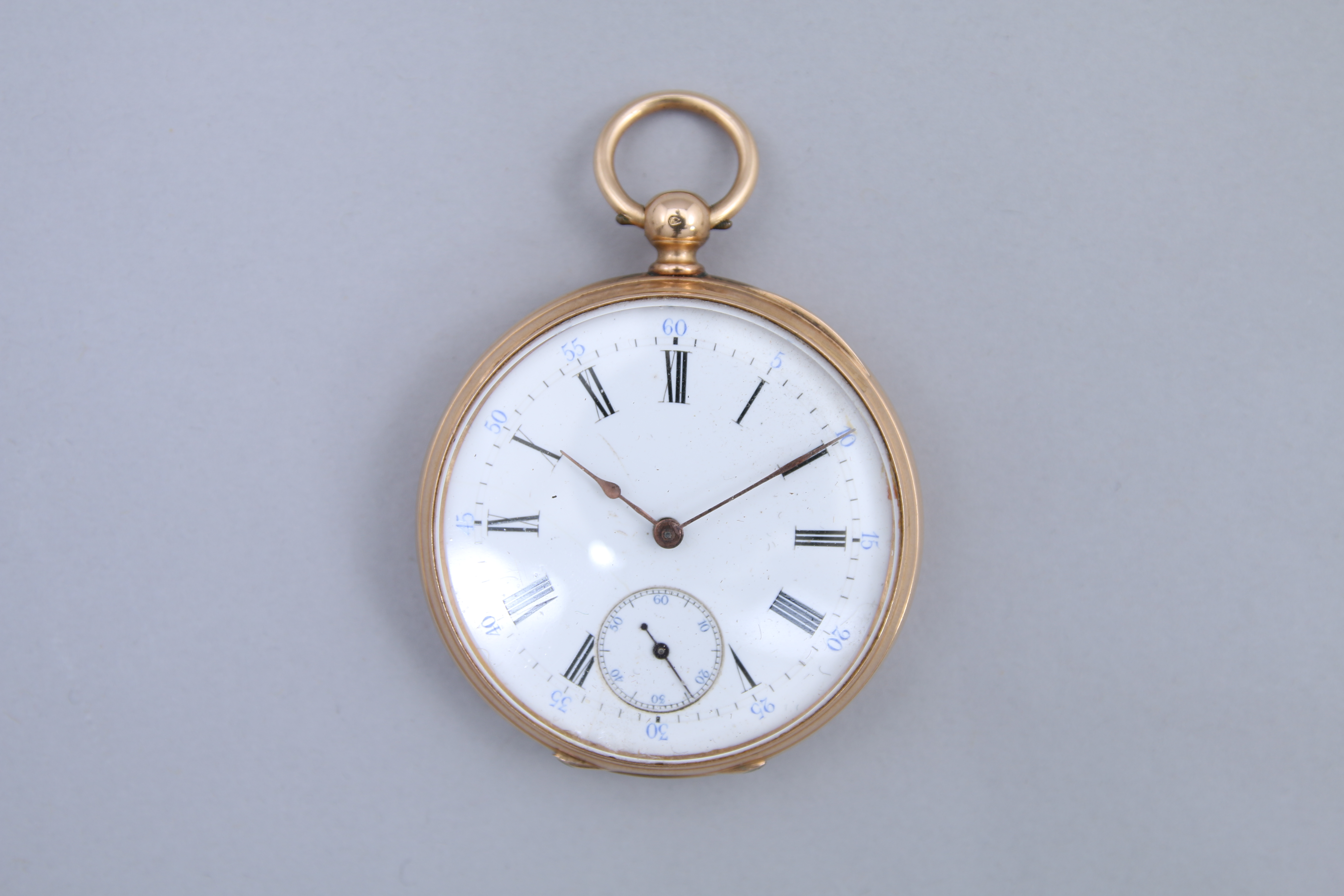MONTRE de GOUSSET à remontoir à clef en or jaune 750 millièmes. Le cadran émaillé blanc figurant les heures en chiffres romains et les minutes en chiffres arabes. Les secondes dans un cadran à six heures.