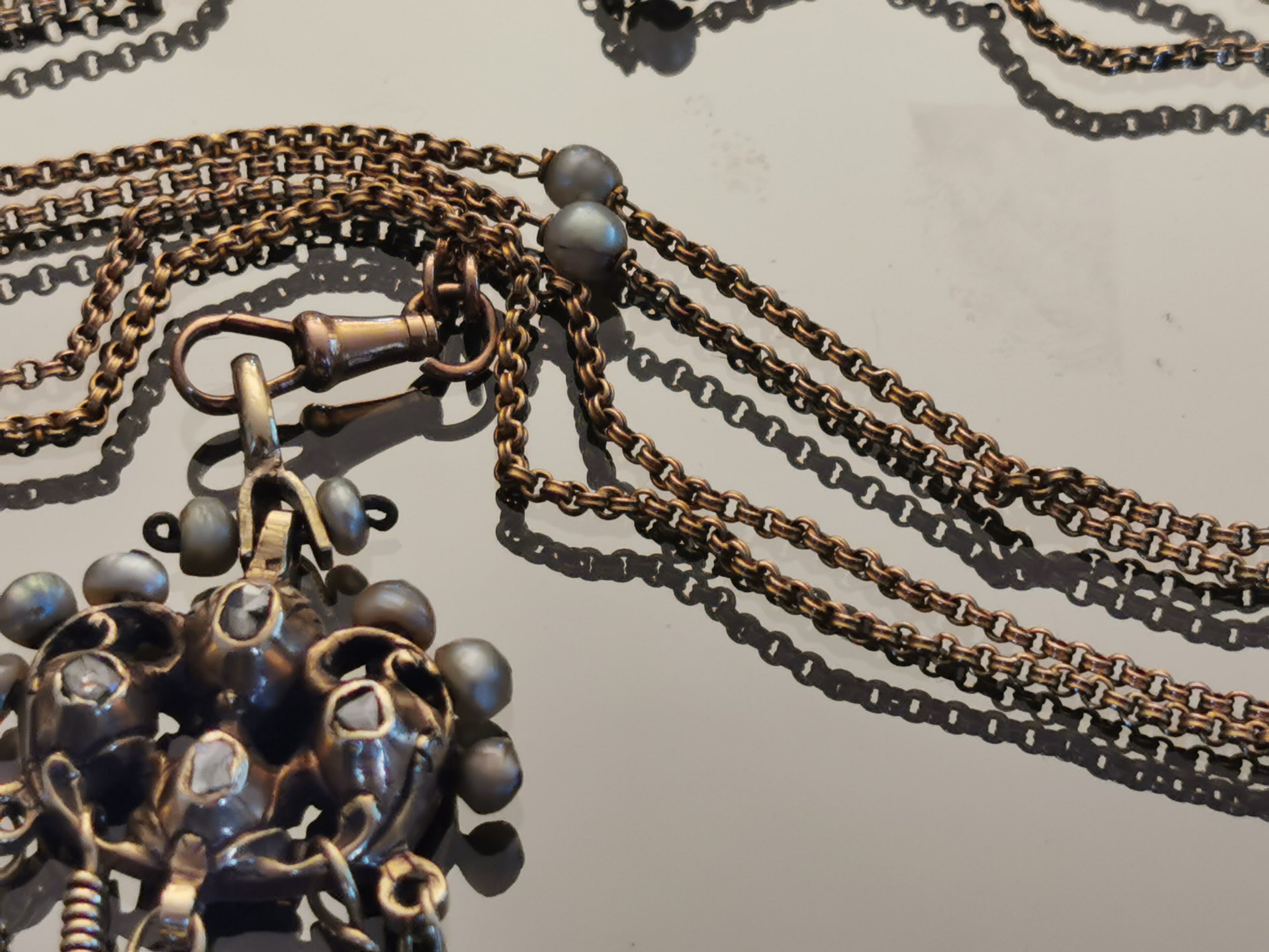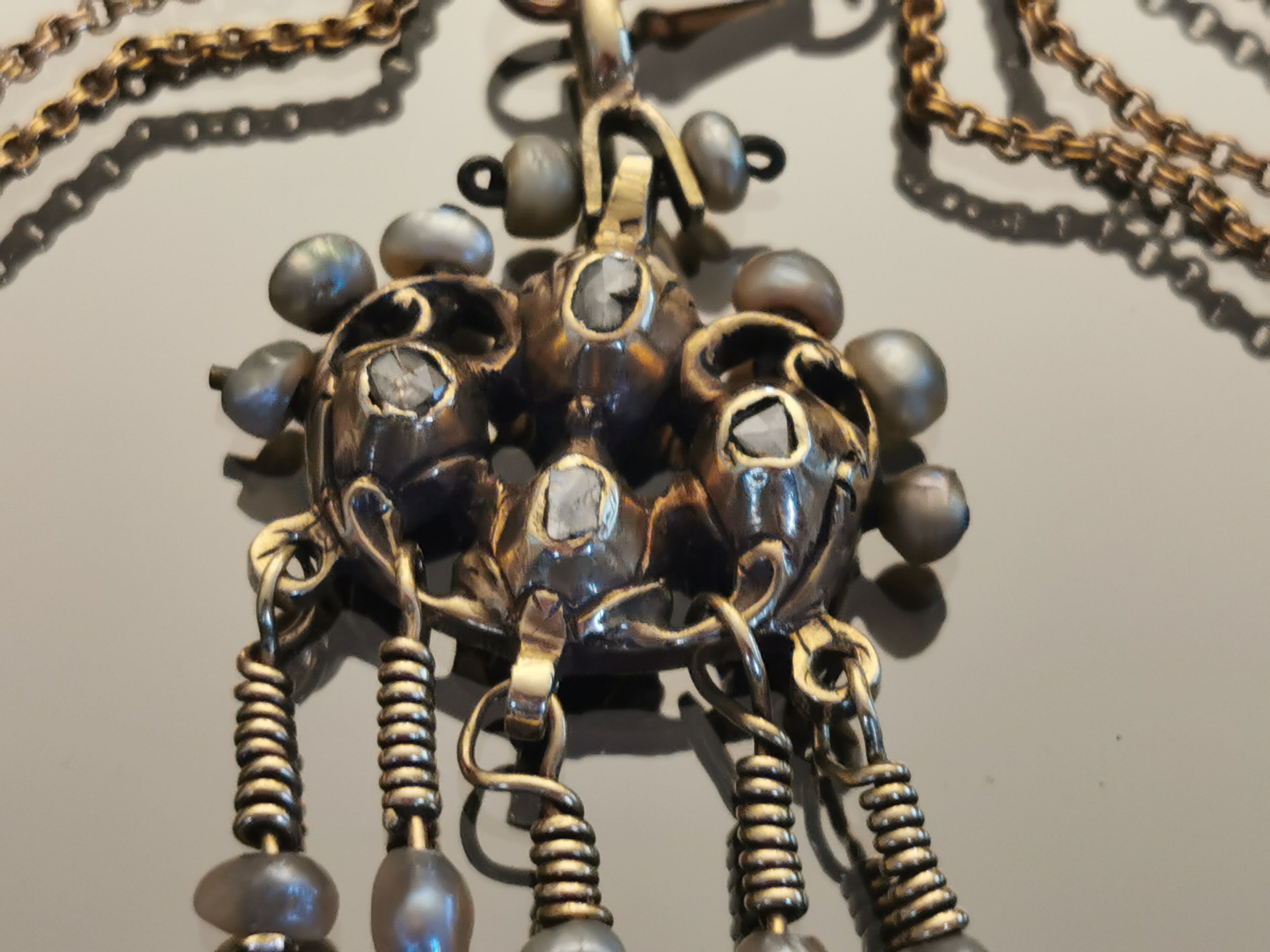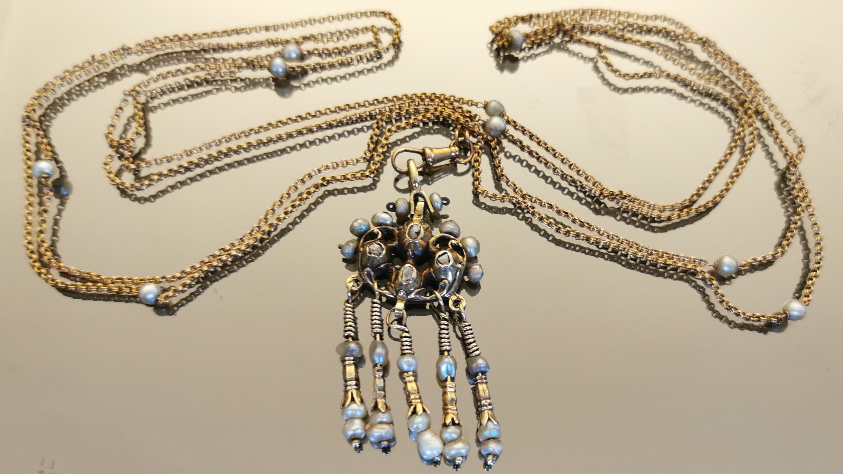PENDENTIF et une CHAINE en or jaune 750 millièmes à décor de motifs floraux et croisillons surmonté de huit perles et se terminant par cinq colonnettes composées chacune de trois perles. La chaîne à alternance de maille et perles.