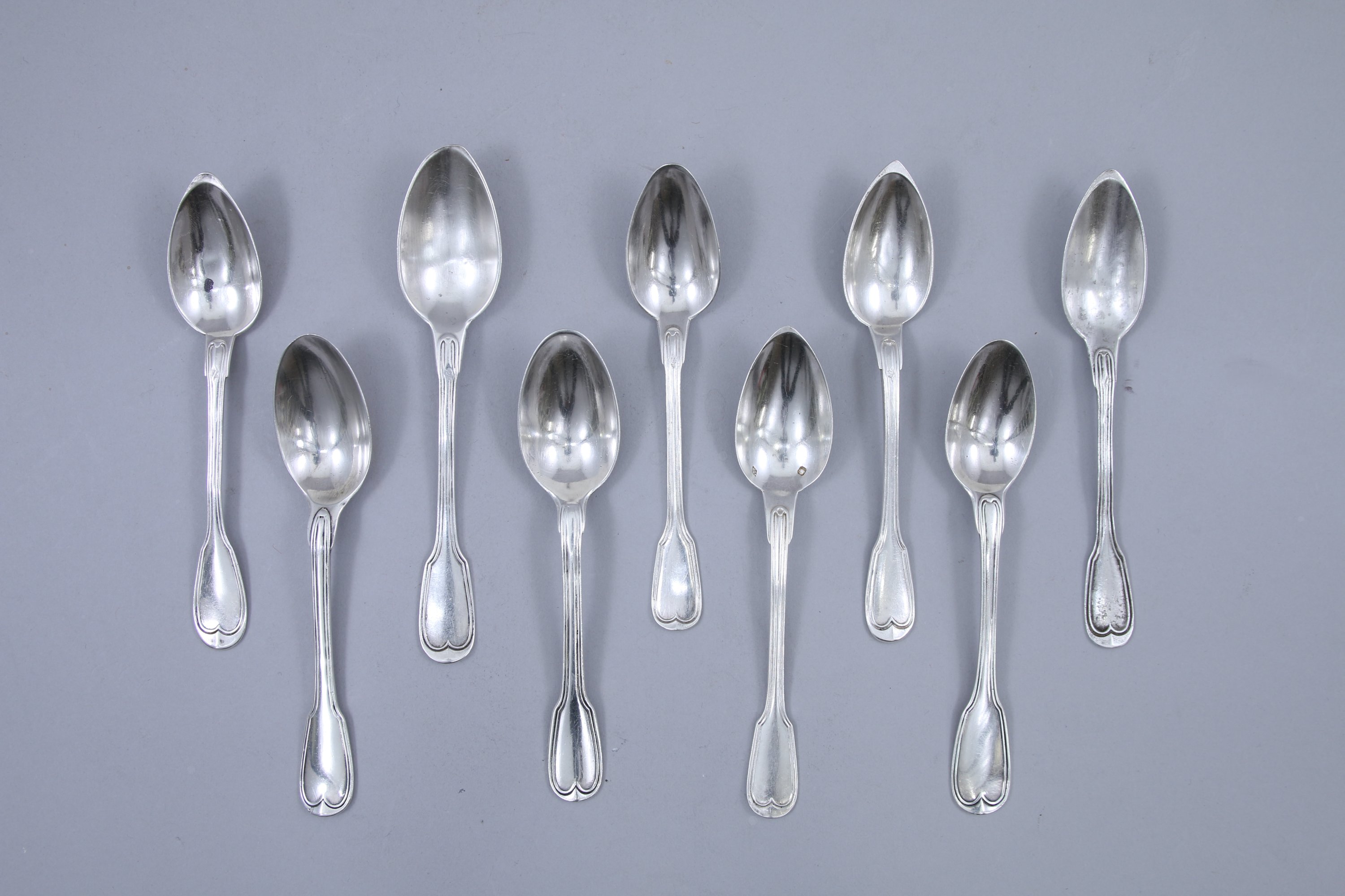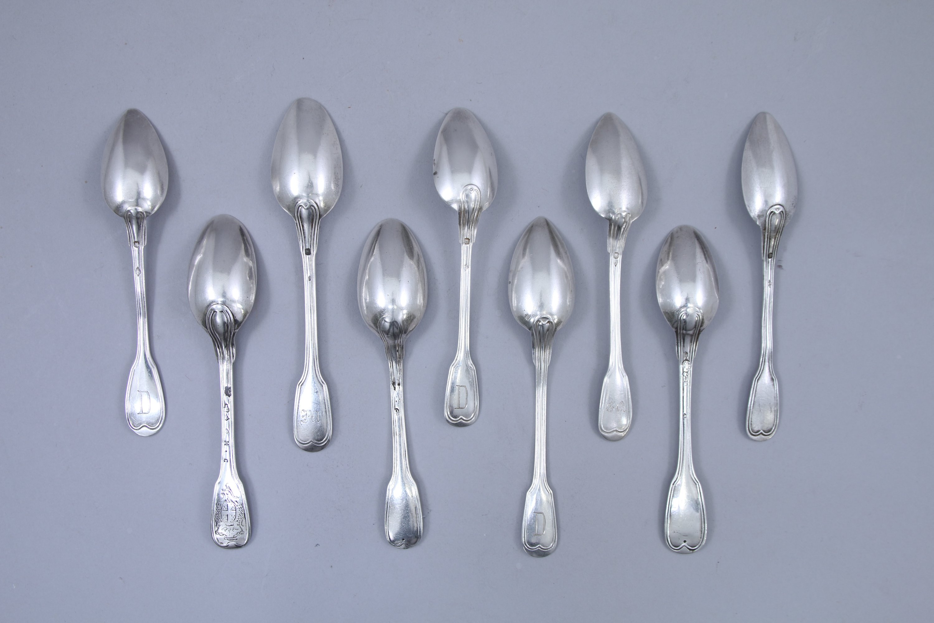 Neuf PETITES CUILLERS modèle filet. Certaines gravées de chiffres, une d'armes.