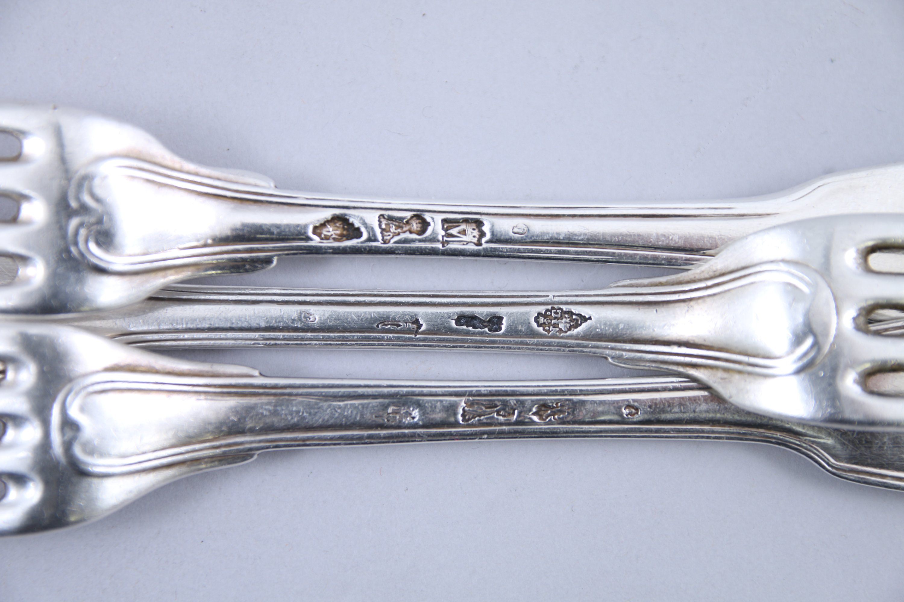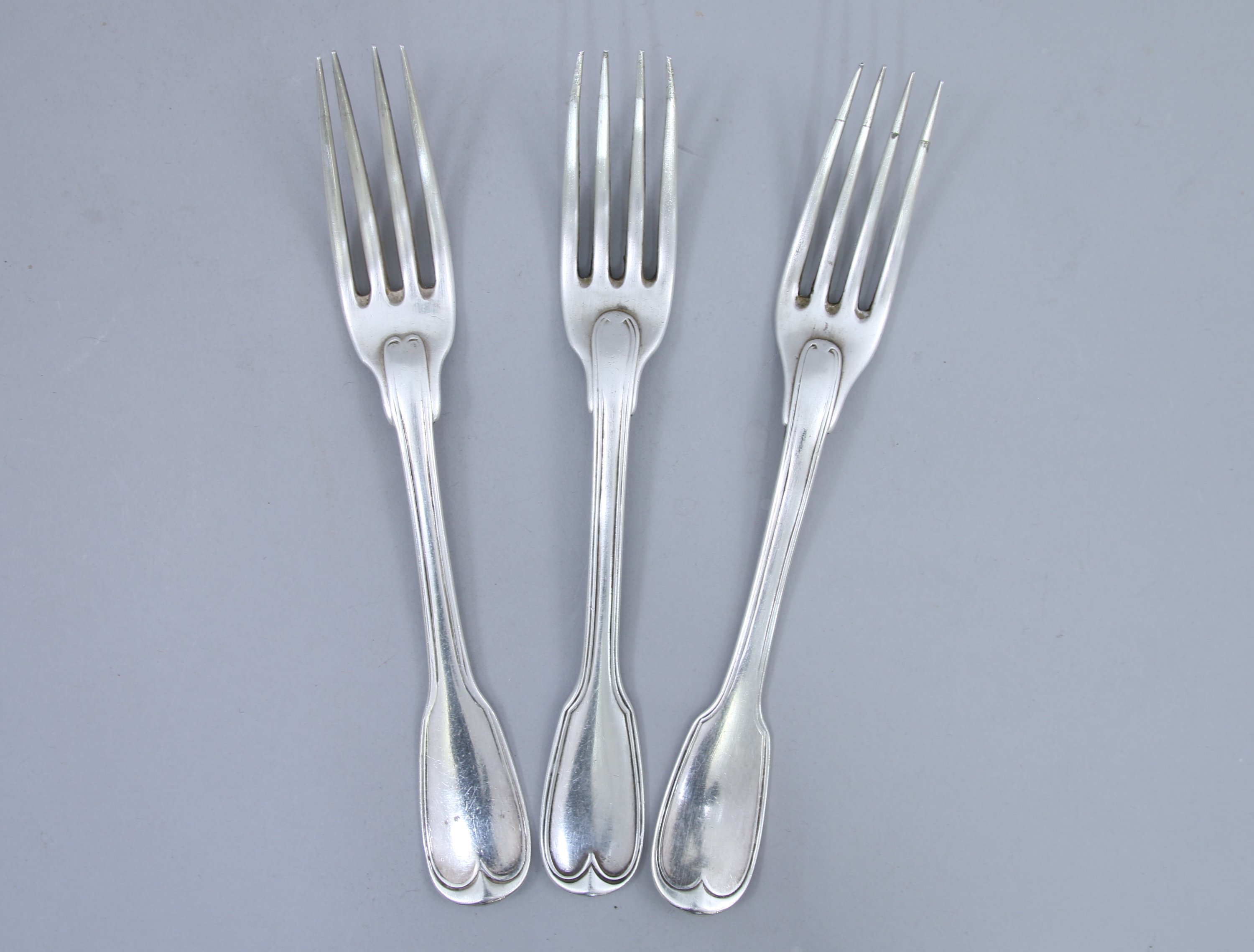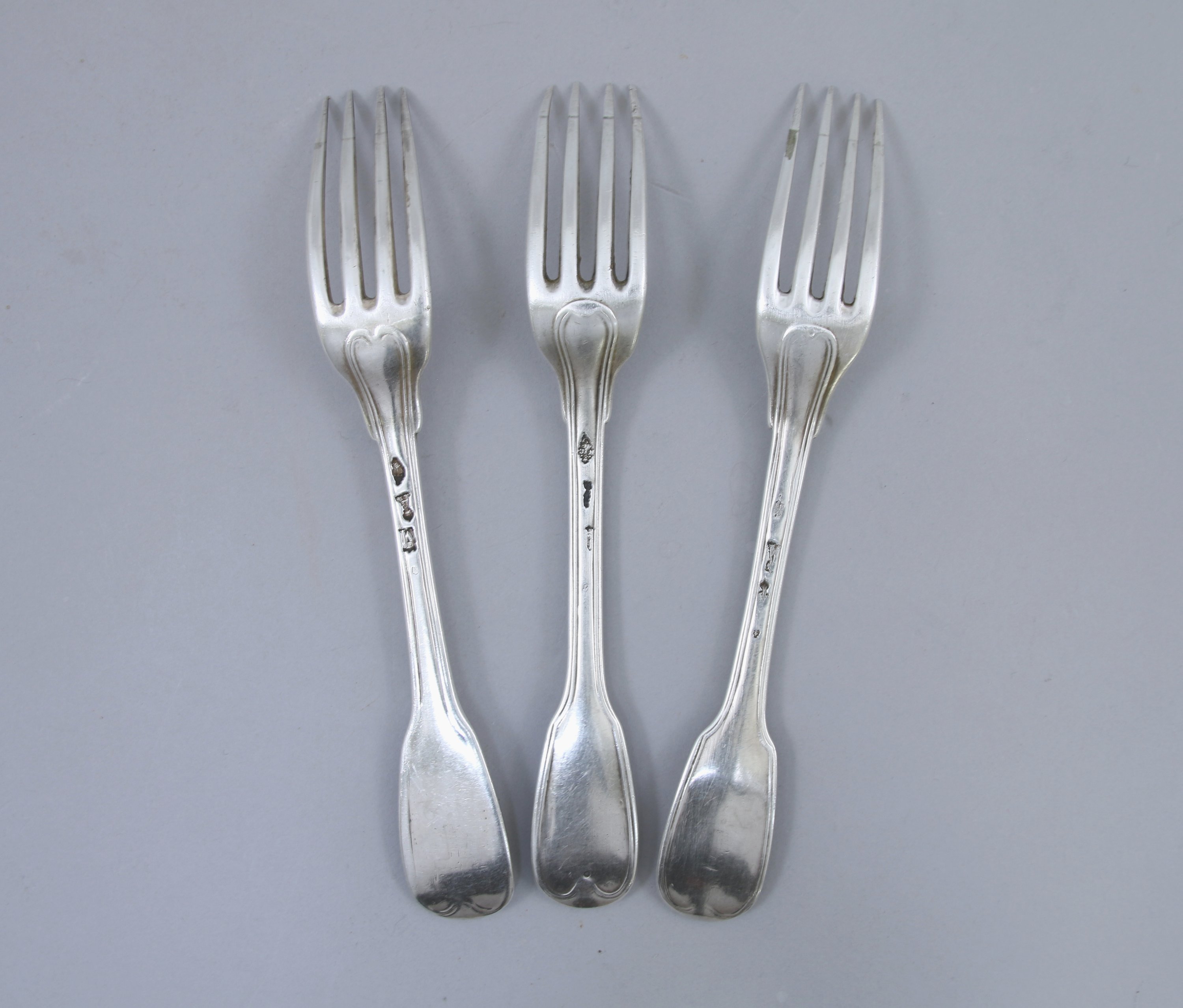 Trois FOURCHETTES en argent modèle uniplat. Deux au moins autrefois gravées d'une croix partiellement effacée.