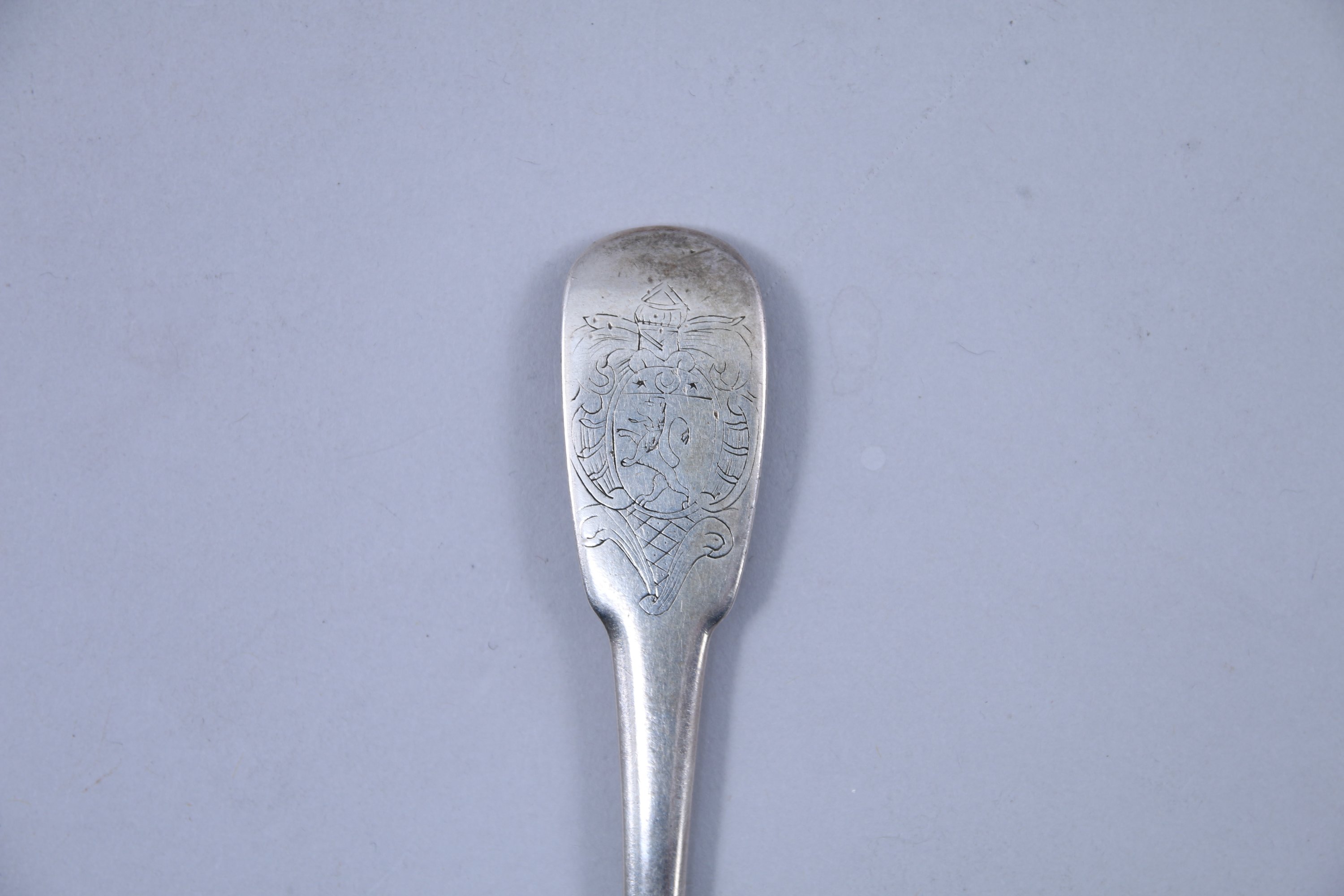 Trois COUVERTS et une FOURCHETTE en argent modèle uniplat. Ils sont gravés d'armes surmontées d'un heaume.